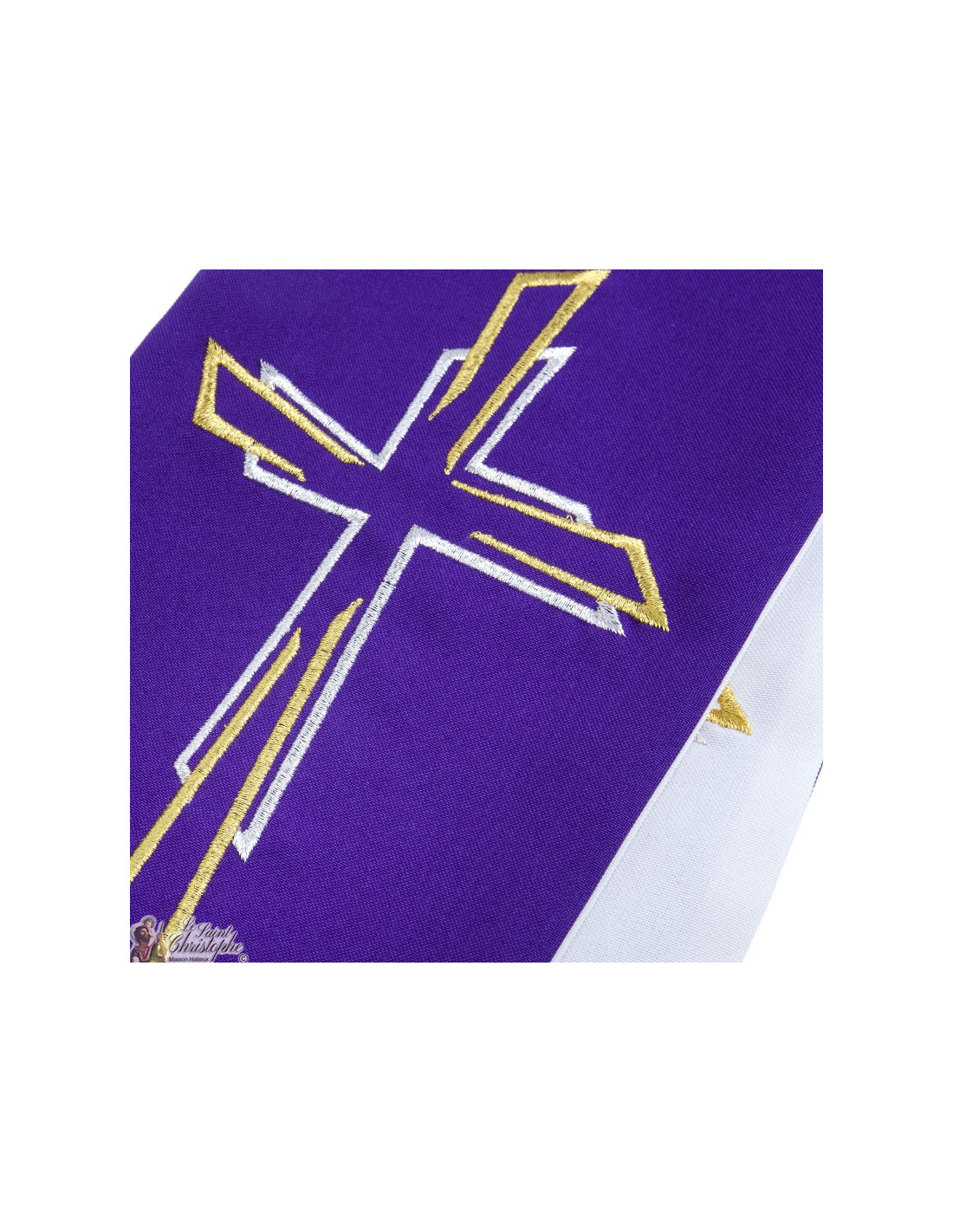 Esta estola de sacerdote bicolor es de doble cara o reversible. Un lado es blanco, el otro morado. Ambas caras están bordadas con hilo de oro y plata, cuatro bordados idénticos. El diseño es una cruz de estilo moderno y sencillo.