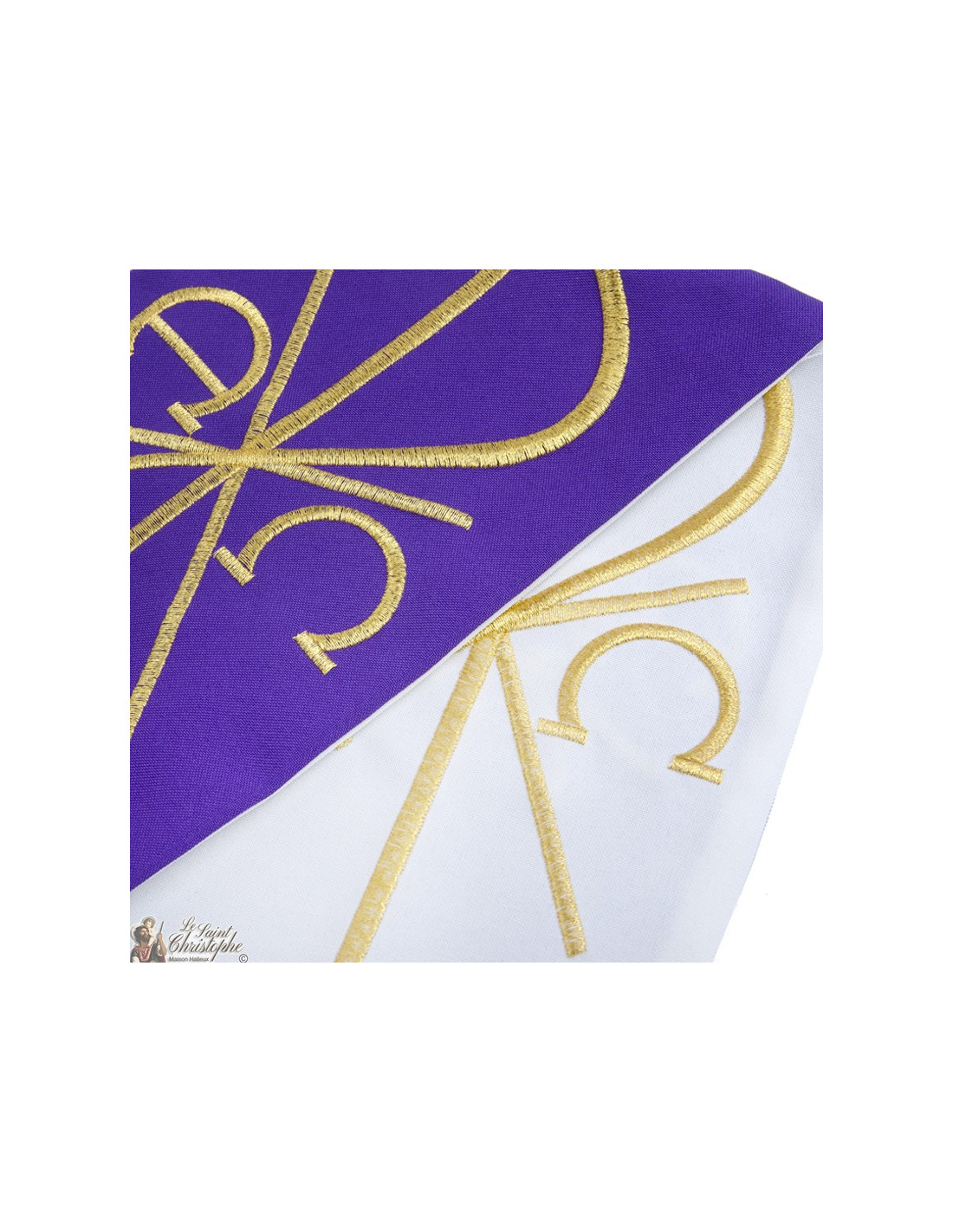 Un lado es violeta y el otro blanco. Los cuatro extremos están bordados con el símbolo PAX Alfa y Omega en hilo dorado.
