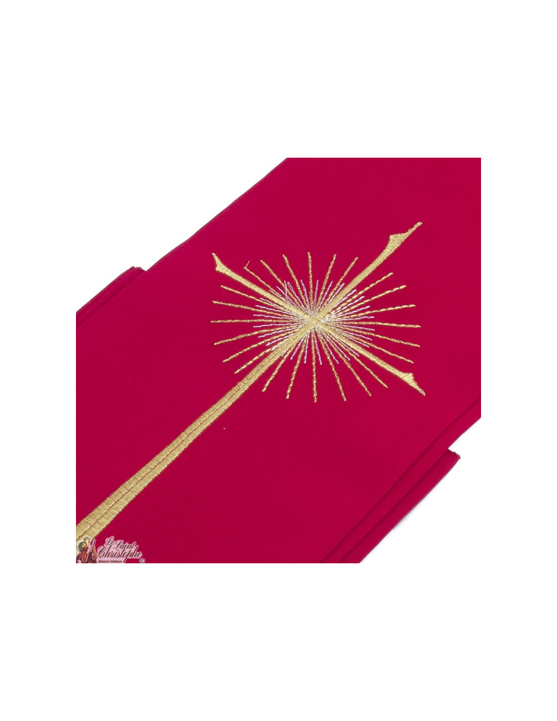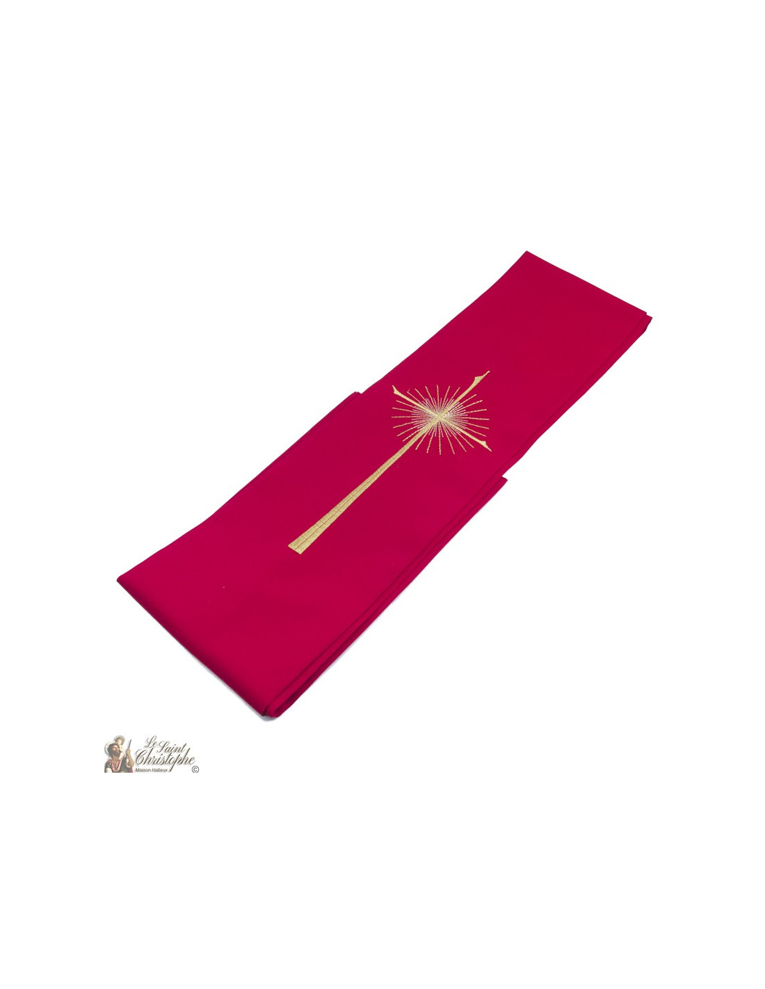 Estola de sacerdote roja y bordada. Totalmente hecha a mano, la estola es fácil de cuidar y se puede lavar a máquina. El bordado en hilos dorados, que representa una fina y elegante cruz aureolada por brillantes rayos.