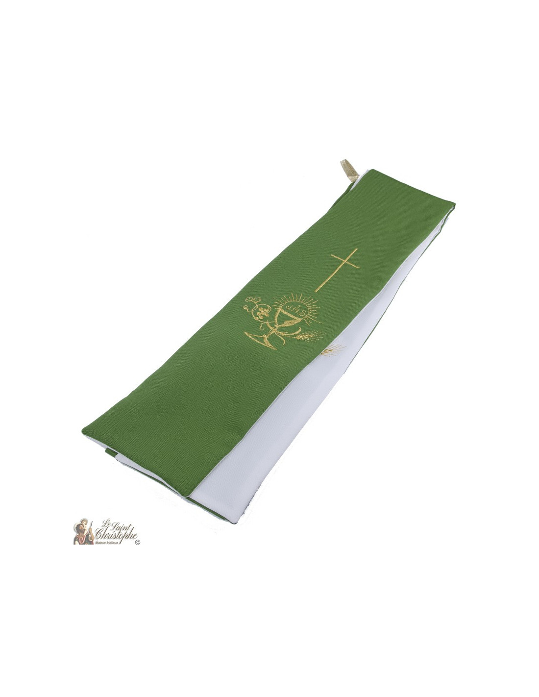Esta estola sacerdotal bicolor es de doble cara o reversible. Un lado es verde, el otro blanco. Ambas caras están bordadas con hilo de oro, cuatro bordados idénticos. El diseño representa el cáliz de la misa rodeado por la espiga de trigo y el racimo de uvas, coronado por la sagrada hostia de JHS, todo ello presidido por una cruz.