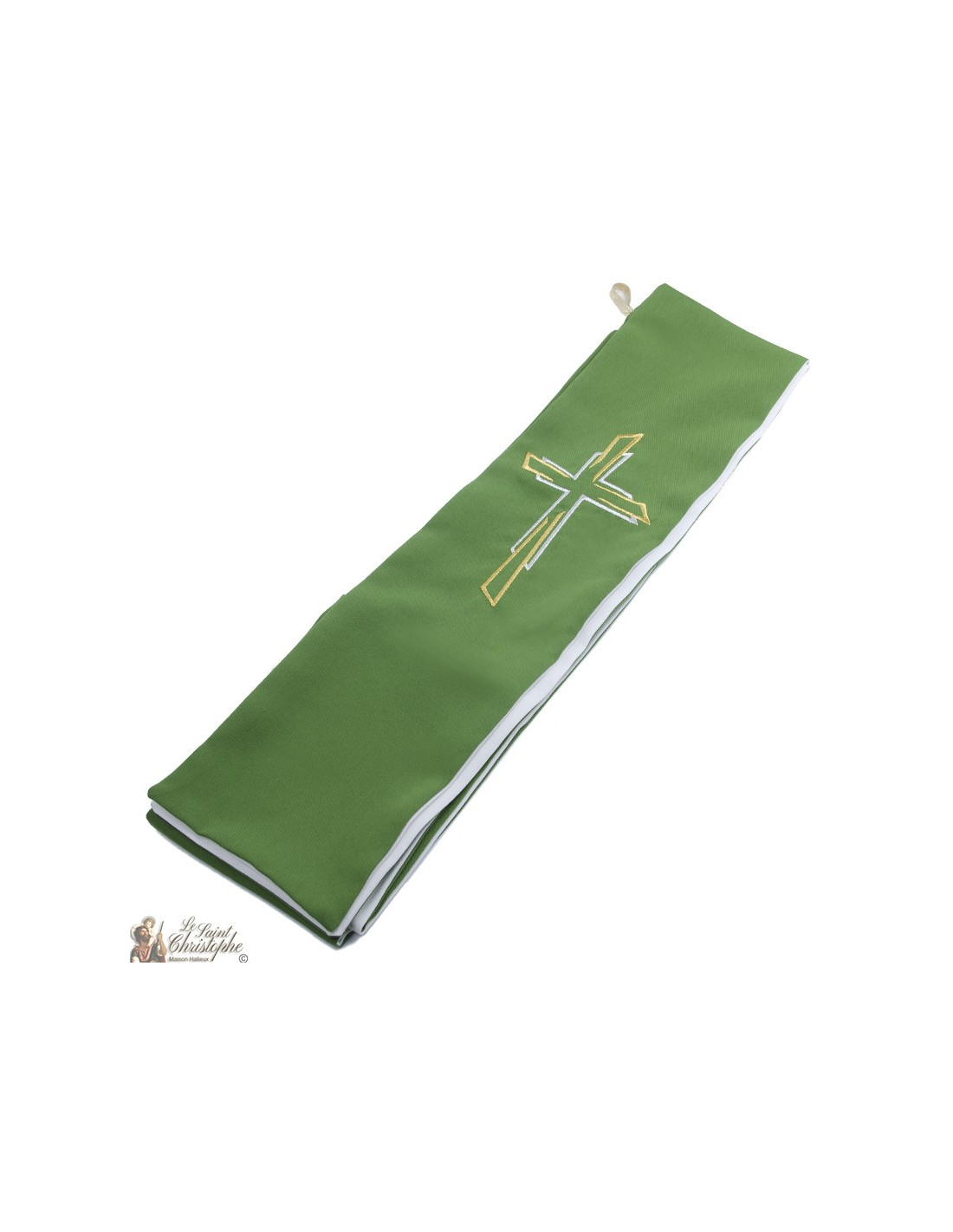 Esta estola sacerdotal bicolor es de doble cara o reversible. Un lado es verde, el otro blanco. Ambas caras están bordadas con hilo de oro y plata, cuatro bordados idénticos. El diseño es una cruz de oro y plata con un estilo moderno y vibrante.