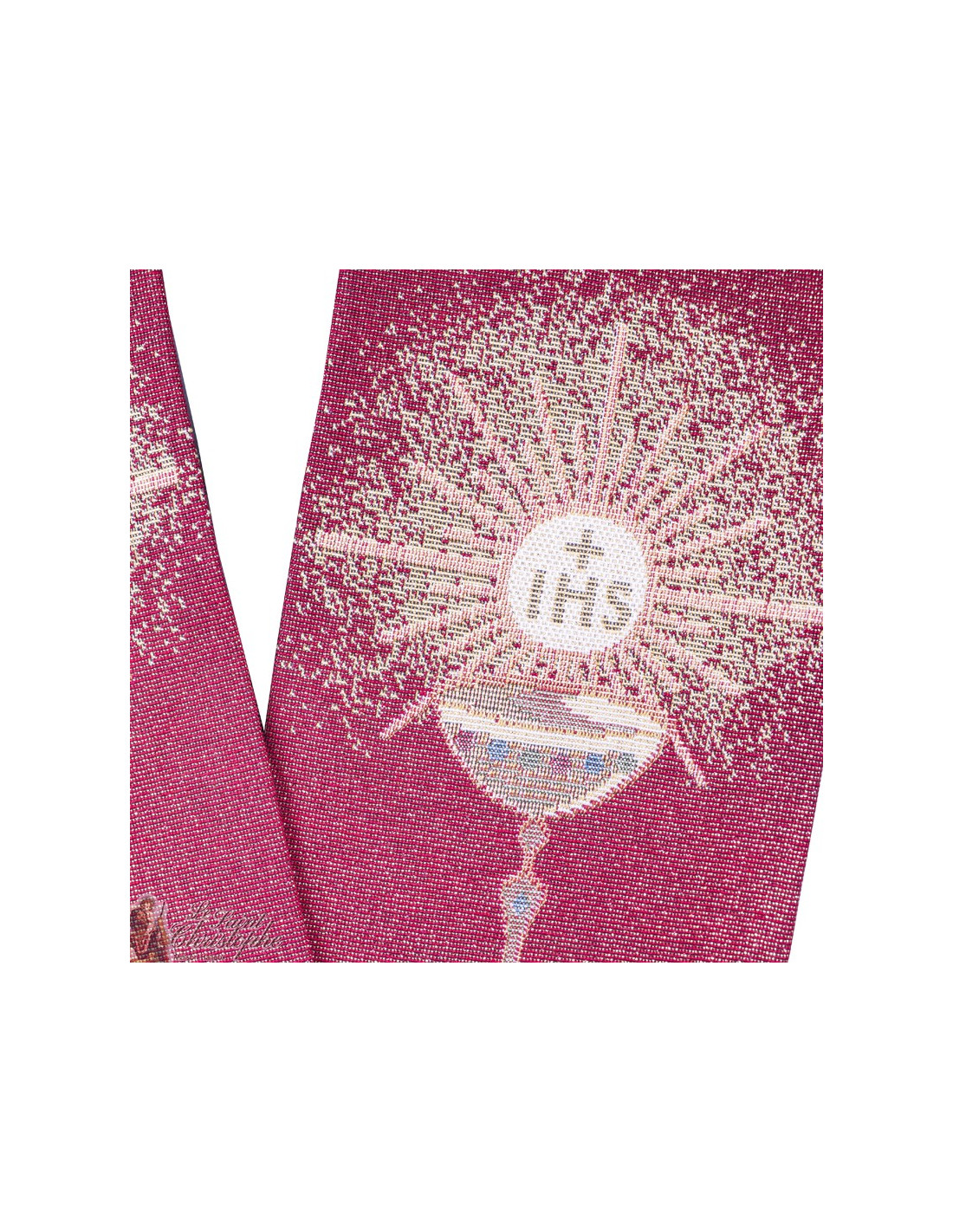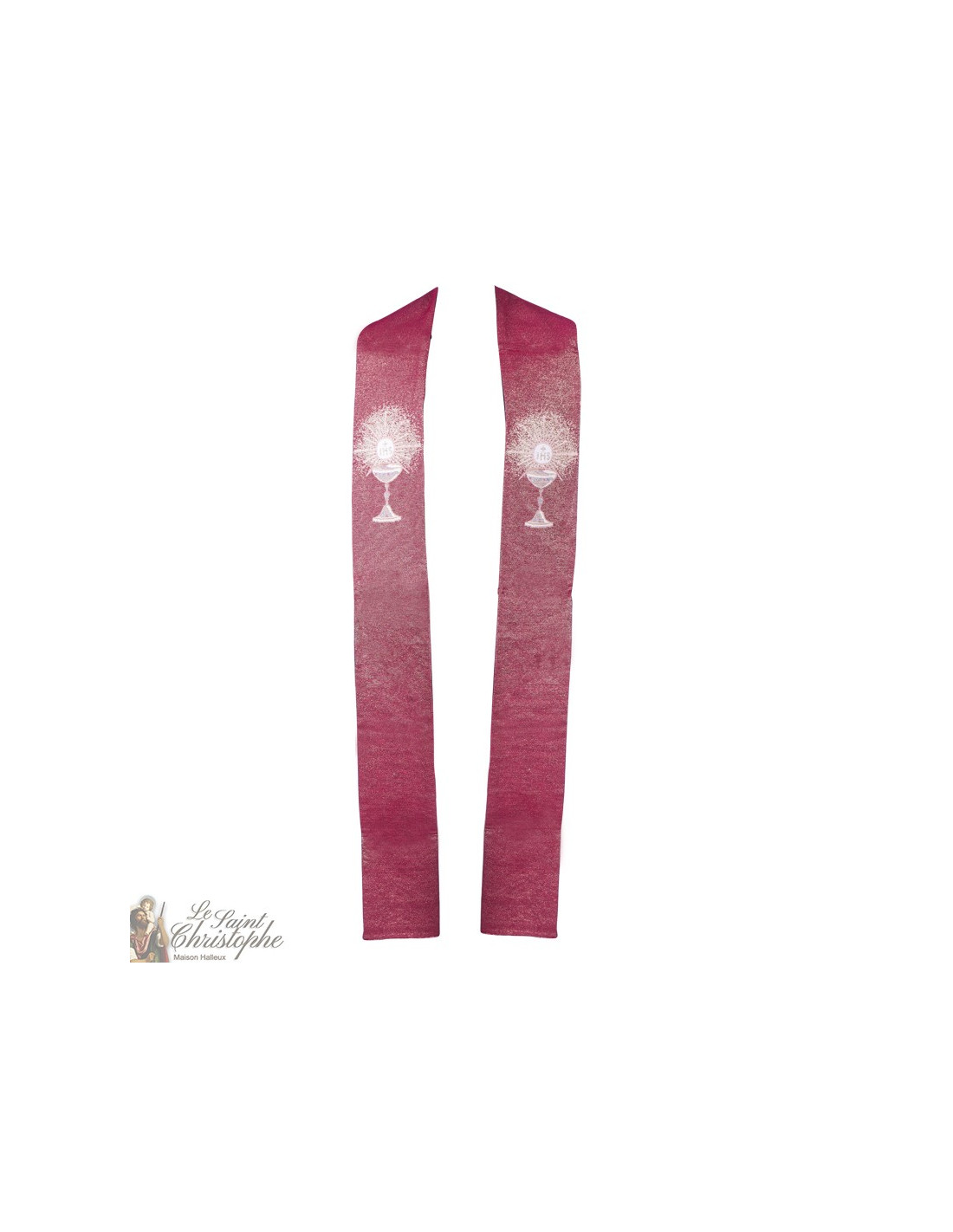 Estola sacerdotal, de color rojo y bordada con un cáliz blanco, coronada por la sagrada hostia que emite una luz divina finamente trabajada. El bordado es del tipo tapiz de gobelinos con un excelente acabado. La estola es lavable a máquina.