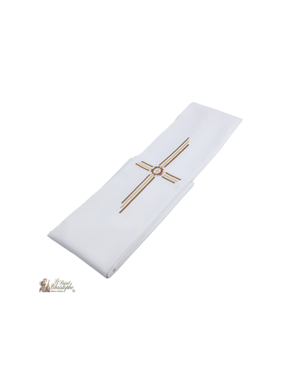 Estola de sacerdote de color crema bordada con una cruz en hilos dorados y marrones cobrizos.