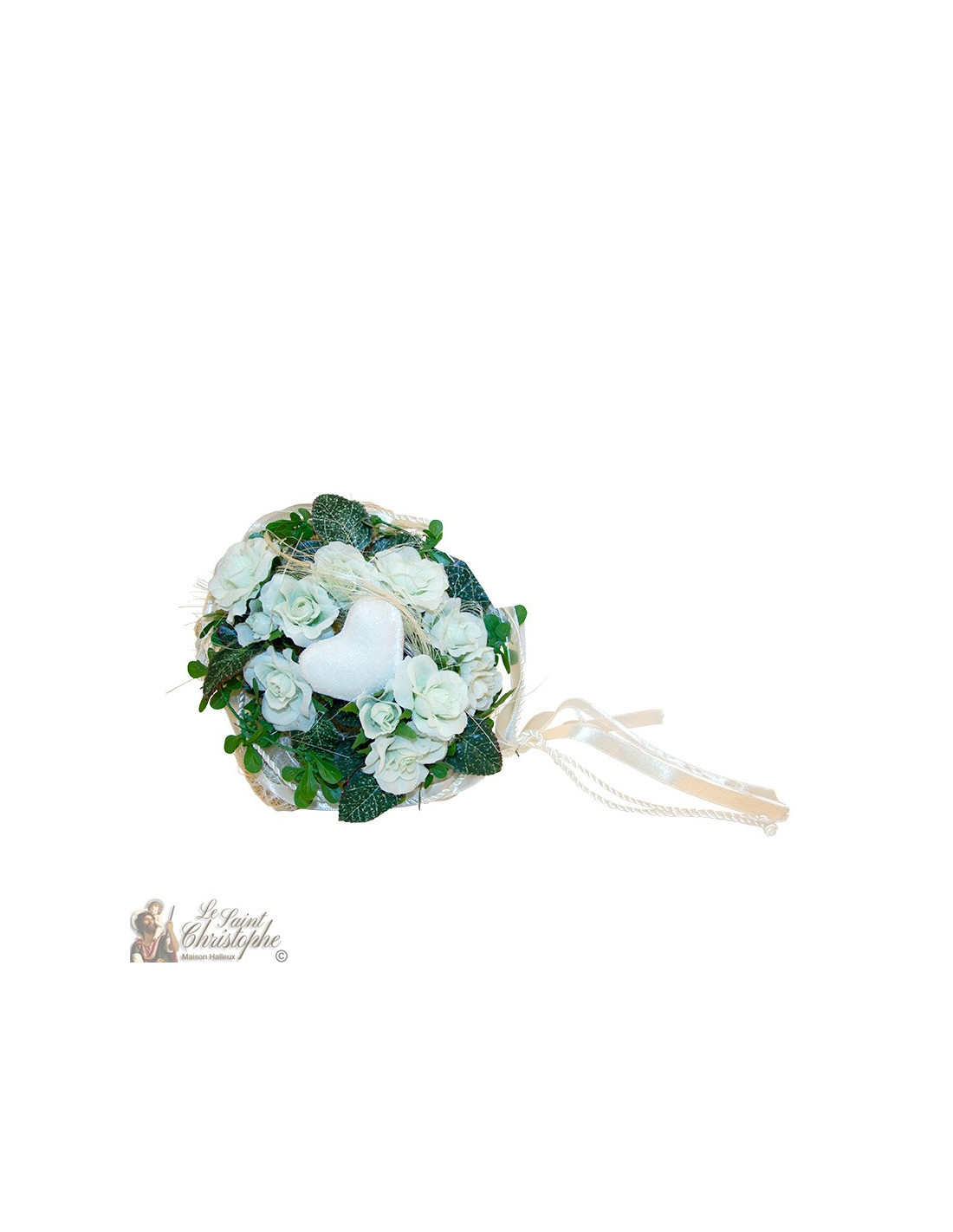 El reverso del ramo tiene la forma de una flor hecha de hilos entrelazados de color beige. Está rodeado de cintas y cordones blancos. El centro del ramo está decorado con un corazón de felpa blanca.
