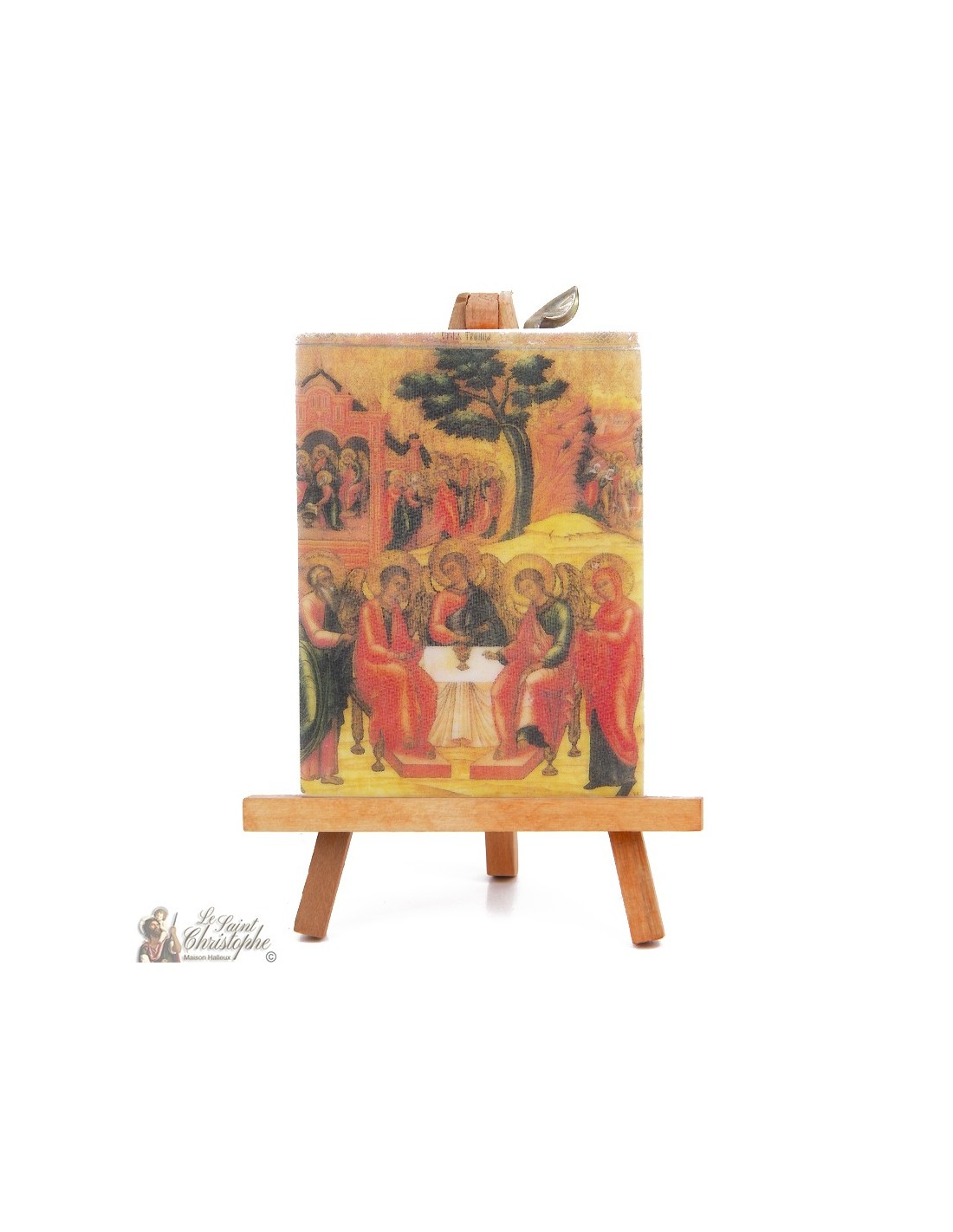 Este icono cristiano ortodoxo representa la Santísima Trinidad del Antiguo Testamento con delicadeza e intensidad. Colocado sobre un caballete de madera natural, decora elegantemente un rincón de oración o un interior inspirado. Su cuidada reproducción, rica en detalles y colores cálidos, invita a la meditación. Un hermoso regalo de fe o meditación.