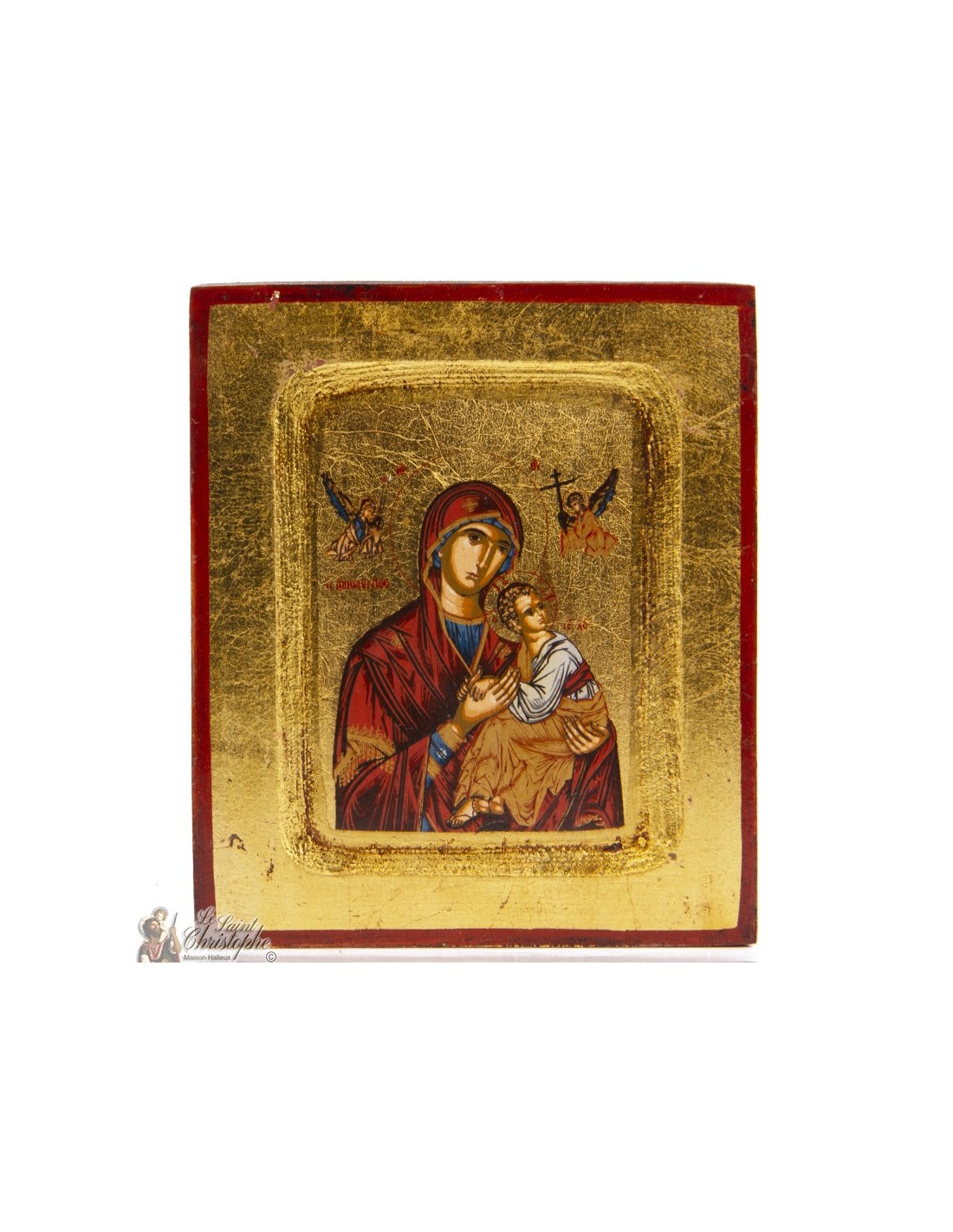 Este icono representa a la Virgen Hodegetria, una de las representaciones de María más veneradas en la tradición ortodoxa. Se la muestra de frente, sosteniendo al Niño Jesús sobre su brazo izquierdo, mientras lo señala con su mano derecha como «el Camino». Jesús, en un gesto de bendición, sostiene un pergamino que simboliza la sabiduría divina. El pan de oro ilumina la escena, resaltando la profundidad de esta obra espiritual. Realizada en madera con esmero y fervor.