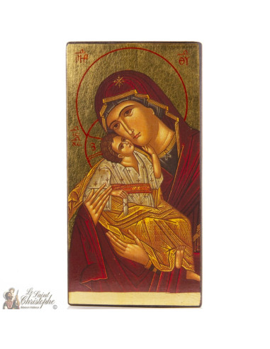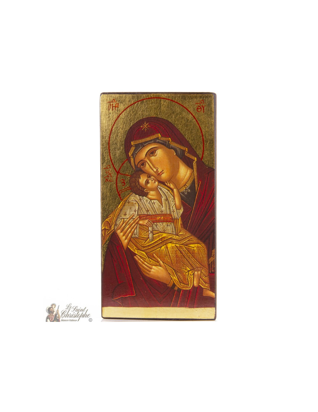 Este icono bizantino representa a la Virgen Glykophiloussa (“Beso dulce”), uno de los tipos más tiernos de la iconografía mariana. Está pintado a mano sobre madera y dorado con pan de oro. La Madre de Dios abraza tiernamente a su Hijo, sus rostros se unen en un gesto íntimo. Una imagen profunda de amor, dulzura y fe, perfecta para la oración personal o como regalo espiritual.