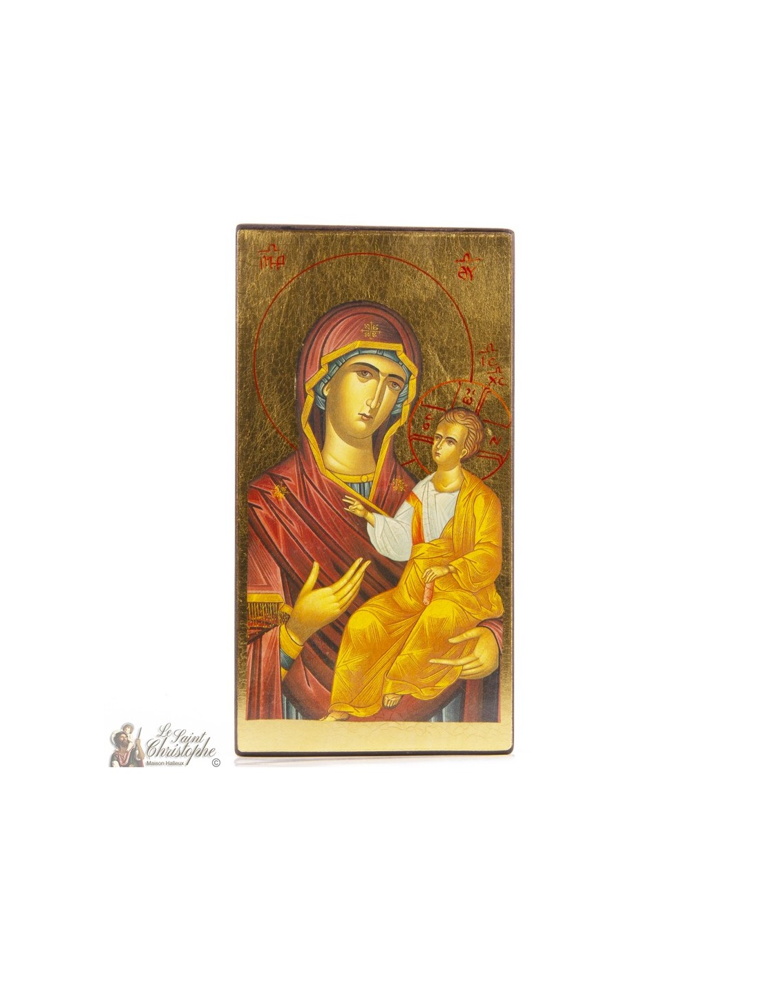 Este icono representa a la Virgen Odigitria, una de las representaciones de María más veneradas en la tradición ortodoxa. Se la muestra mirando hacia adelante, sosteniendo al Niño Jesús en su brazo izquierdo, mientras lo señala con su mano derecha como "el Camino". Jesús, en gesto de bendición, sostiene un pergamino que simboliza la sabiduría divina. La pan de oro ilumina la escena y resalta la profundidad de esta obra espiritual. Realizado en madera con mimo y fervor.