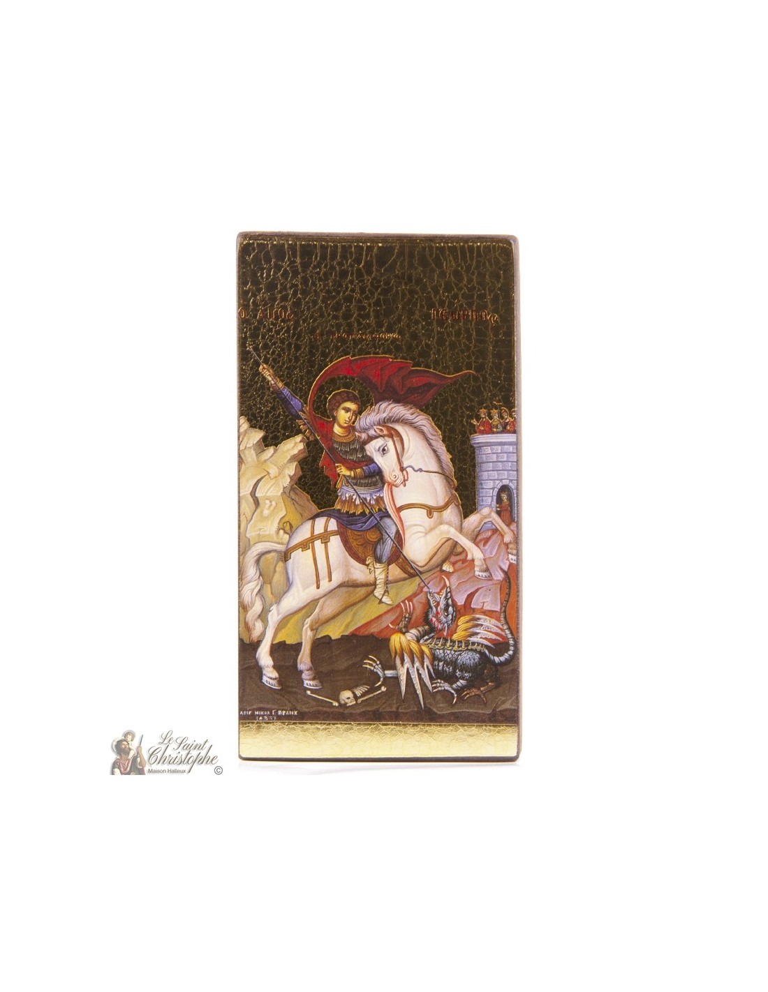 Este icono representa a San Jorge, montado en su caballo blanco, matando al dragón, emblema de las fuerzas del mal. Está pintado a mano sobre madera dorada con pan de oro. Símbolo universal de victoria a través de la fe, esta obra expresa protección divina, valentía espiritual y el compromiso del creyente para enfrentar las pruebas.