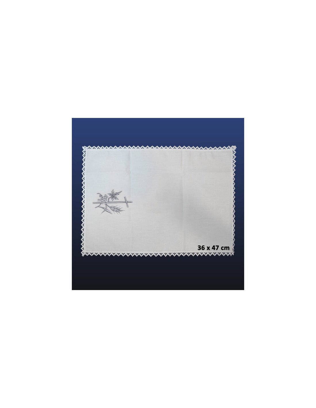 Este conjunto de lino de misa está bordado con una cruz rodeada de espigas de trigo, con hilo de plata. Todos ellos tienen un borde de encaje. El conjunto se hizo a mano.