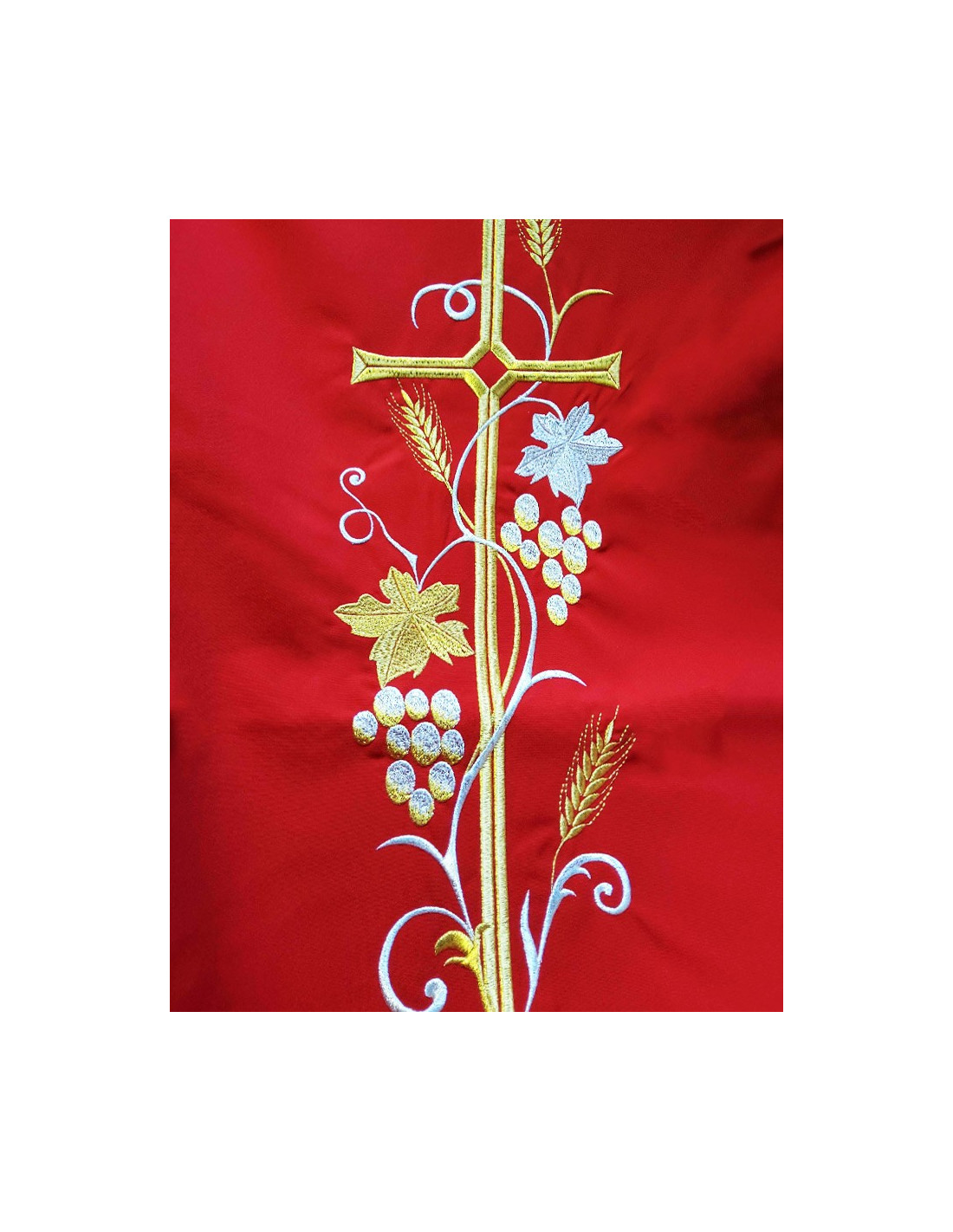 Bordado: Hilo dorado – cruz, espigas y racimos de uvas