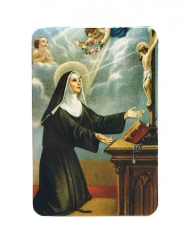 Imán con la imagen de Santa Rita para pegar en una superficie metálica. Para una mayor duración del producto, recomendamos encarecidamente utilizar este imán sólo en interiores: nevera, escritorio metálico, puerta, tablón de anuncios, etc. Muestra la imagen de Santa Rita en beatitud ante la Cruz de Jesucristo.