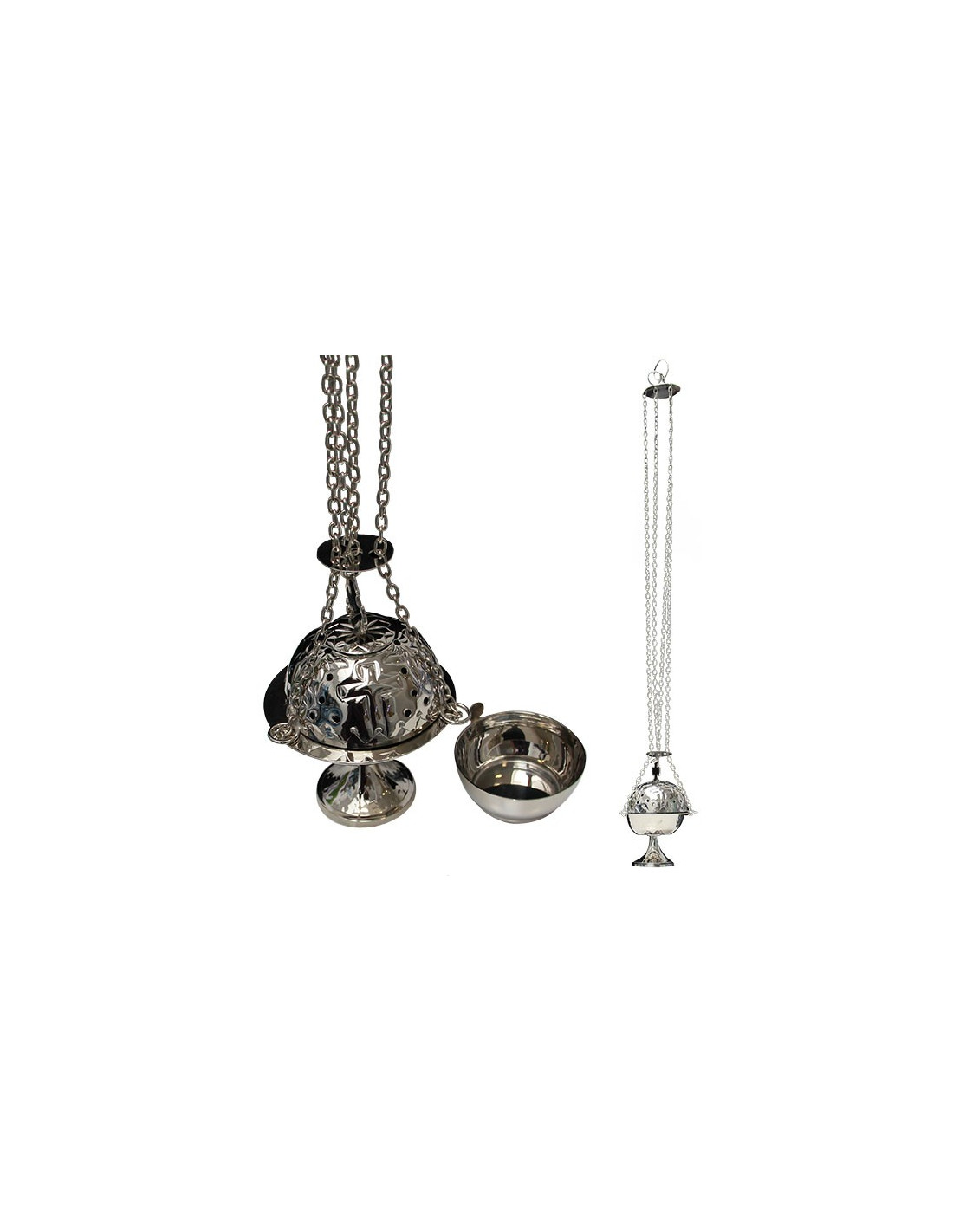 Este incensario, hecho totalmente a mano, es de metal plateado con cruces y otras formas geométricas. Puede colocarse en una superficie plana o colgarse de una cadena. Dispone de un recipiente interior para facilitar su uso.
