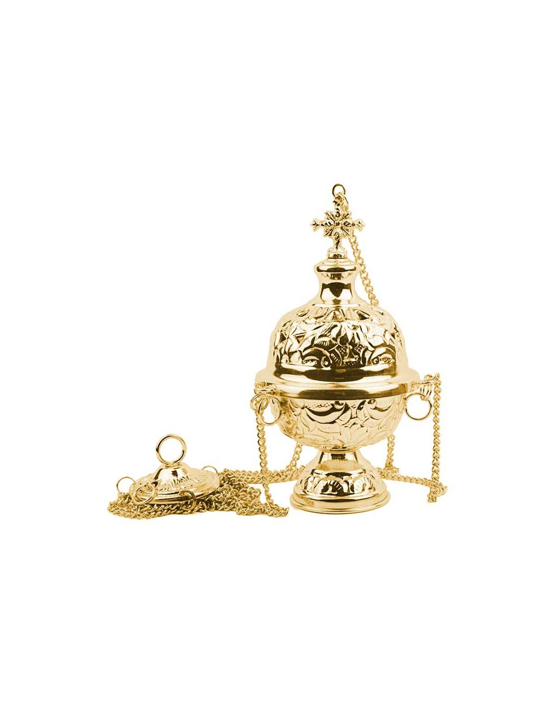 Este incensario colgante dorado lleva grabado un hermoso friso vegetal en su superficie y está rematado con una cruz ricamente decorada. La tapa tiene un agarre fácil y alto, gracias a la cruz. Los agujeros son discretos, se recortan en los espacios blancos del friso y le dan más relieve. El incensario también contiene una rejilla para depositar los trozos de incienso y los granos. Las largas cadenas permiten colgarlo.