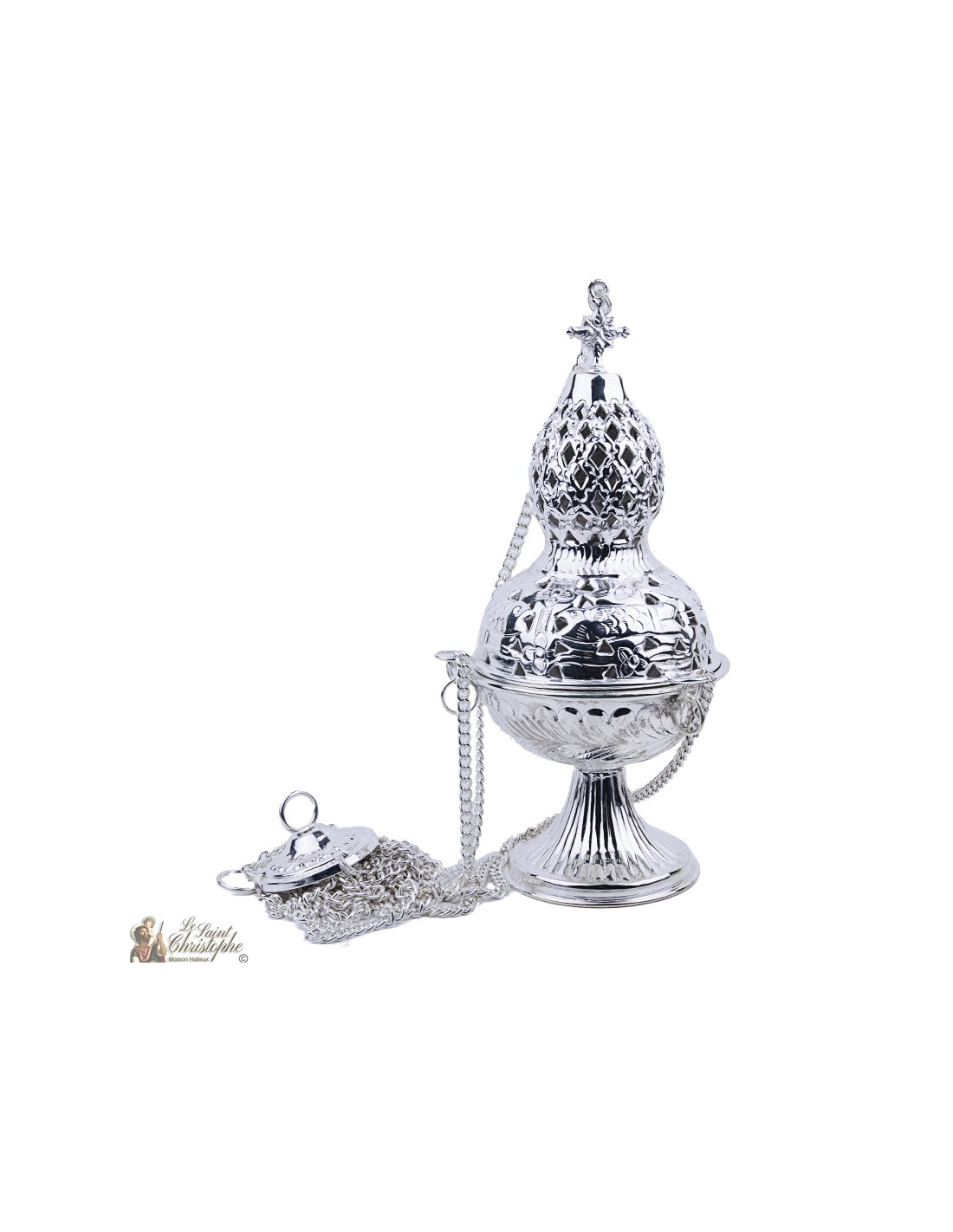 Este incensario colgante bañado en plata lleva grabado un hermoso friso vegetal en la superficie y está rematado con una cruz ricamente decorada. La tapa tiene un agarre fácil y alto, gracias en parte a la cruz y a la forma de lúpulo que la hace aún más grande. Los agujeros son discretos, se recortan en los espacios blancos del friso y le dan más relieve. El incensario también contiene una rejilla para depositar los trozos y granos de incienso. Las largas cadenas permiten colgarlo.