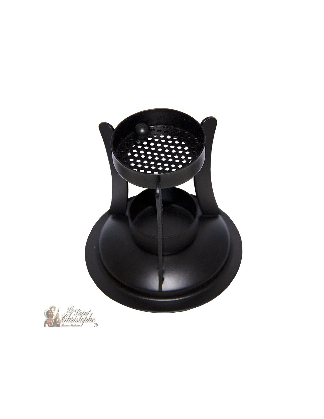Este incensario de hierro forjado negro, de diseño y compacto, puede ser llevado a todas partes con facilidad! En una sola pieza, sólo la rejilla donde poner los granos de incienso es removible para una fácil limpieza.