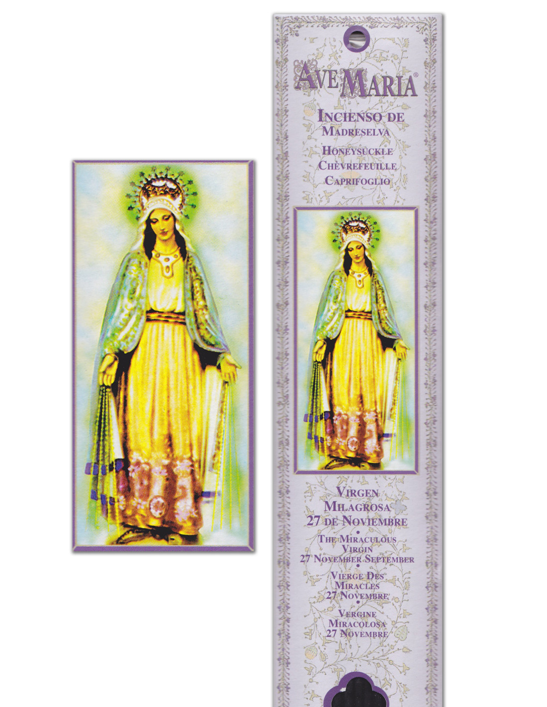 Este estuche, con la imagen de la Virgen Milagrosa y sus flamantes colores, contiene 15 varillas de incienso natural con aroma de madreselva. Se reza principalmente el 27 de noviembre. Utilice este incienso para el placer y el bienestar, para pedir ayuda a la Virgen o a los Santos y, más generalmente, durante las oraciones.