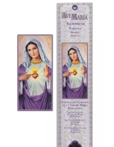 Esta bolsita, con la imagen del Sagrado Corazón de María, de colores brillantes y luminosos, contiene 15 varillas de incienso natural con una energizante fragancia de naranja. Se reza principalmente el 22 de agosto. Este incienso vigorizante se utiliza en particular para abrir la comunicación, la empatía y promover el amor incondicional.