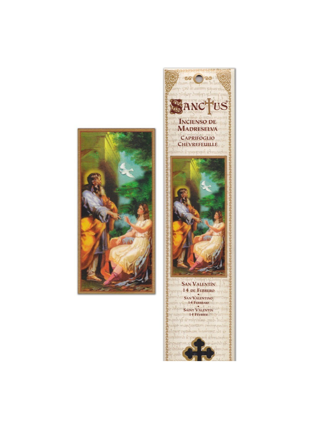 Esta bolsita, con la imagen de San Valentín, en colores vivos, contiene 15 varillas de incienso natural perfumado con madreselva. Se reza principalmente el 14 de febrero. Esta combinación de madreselva y San Valentín refuerza los efectos del incienso. Se recomienda estimular la empatía y la compasión. Ayuda a encontrar un alma gemela y a calmar el dolor del corazón.