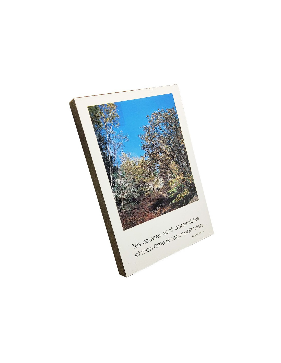 Esta placa de pared de madera presenta una relajante fotografía de un verde bosque con un hermoso cielo azul. Debajo de la imagen hay un versículo bíblico en francés: