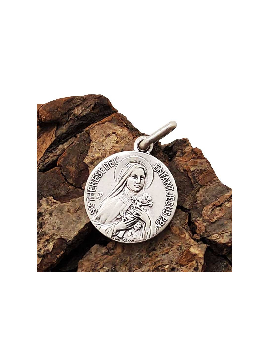 Medalla de Santa Teresa, metal plateado sin níquel. Este colgante de fantasía es redondo. La imagen en bajorrelieve está finamente esculpida y representa el retrato de Santa Teresa de Lisieux. La rodea una frase en francés: Sainte Thérèse de l'Enfant Jésus PPN (ruega por nosotros). Santa Teresa es la patrona de las misiones y de Francia.