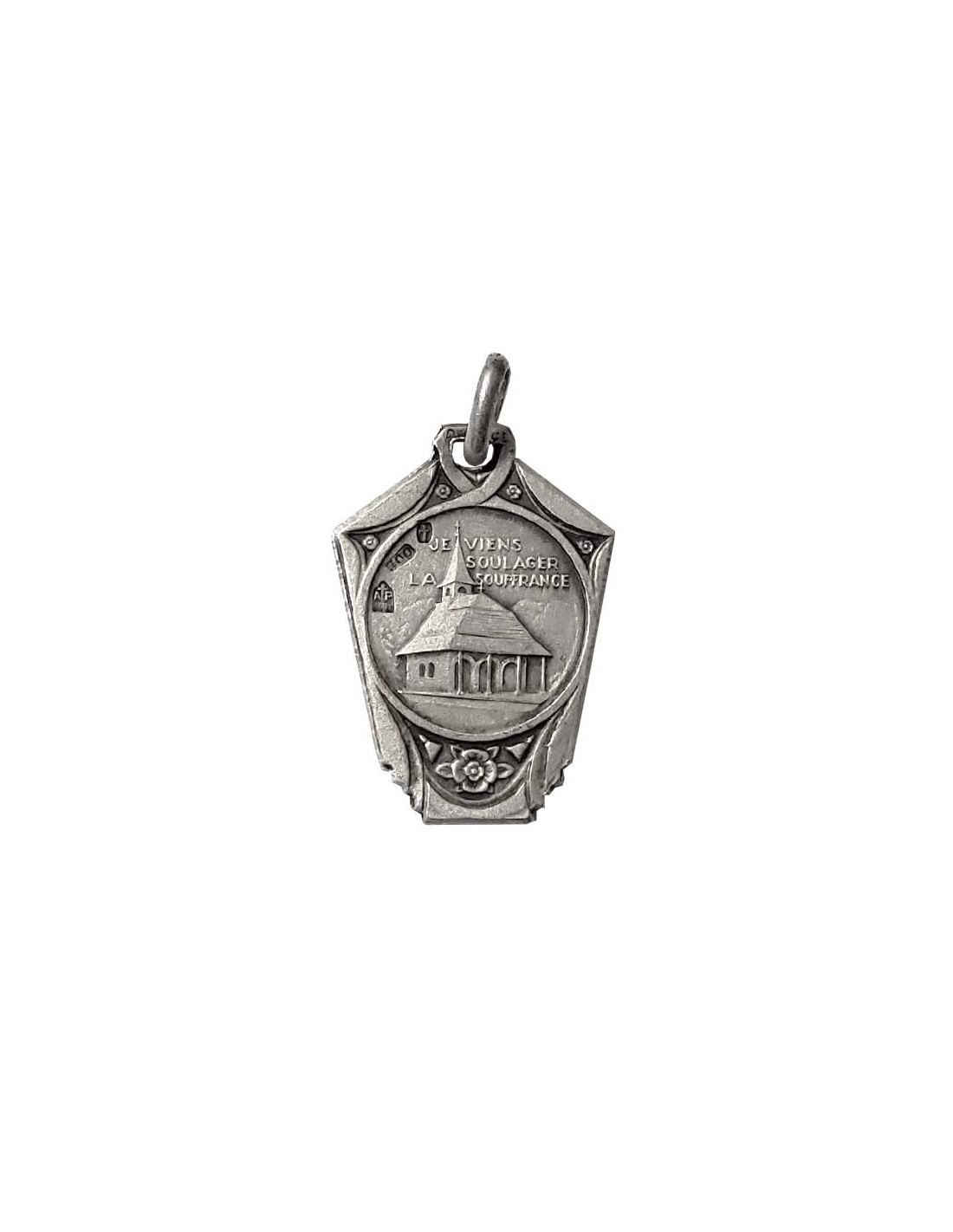 Medalla de Notre Dame de Banneux en el anverso y la capilla de Banneux en el reverso.