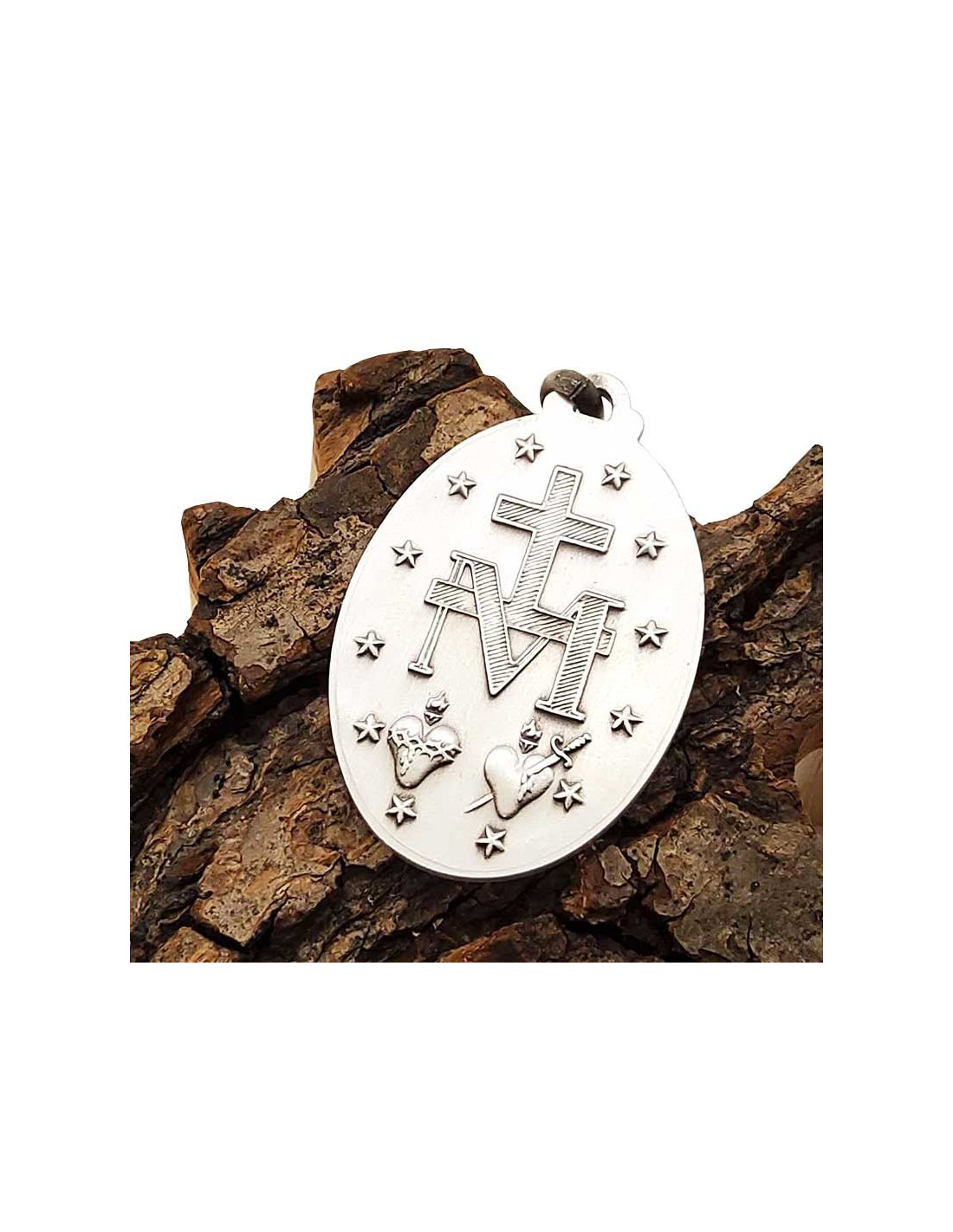 Esta delicada medalla plateada representa a la Virgen Milagrosa en el anverso y el símbolo mariano en el reverso. La Virgen Milagrosa es símbolo de amor incondicional, salud y prosperidad. Una inscripción en latín rodea a la Virgen en el anverso, dando gloria a María. Es también una medalla de protección muy poderosa.
