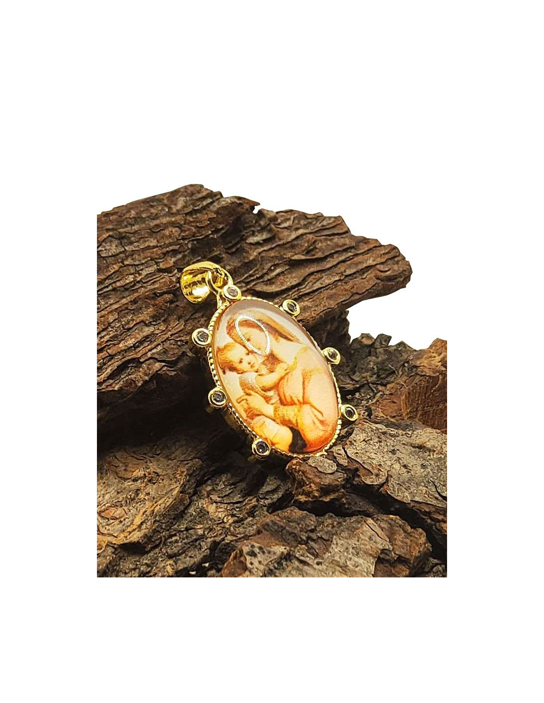 Medalla de la Virgen María y el Niño Jesús en metal dorado fantasía engastado con pedrería. La imagen de María y Jesucristo los representa con vivos colores. La ilustración está protegida por una capa de resina abovedada, formando un bonito cabujón. El borde de la medalla está decorado y engastado con diamantes de imitación. La Virgen y el Niño es un símbolo de amor y de familia feliz. Es un hermoso regalo para un ser querido o para ti mismo, una discreta joya religiosa.