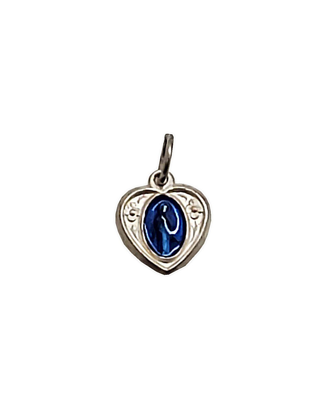Medalla de plata con la imagen de la Santísima Virgen de los Pobres de Banneux Notre Dame. Con forma de corazón, el frente está esmaltado en azul con la Virgen de los Pobres mientras que el reverso es en bajorrelieve del Sagrado Corazón de Jesús.