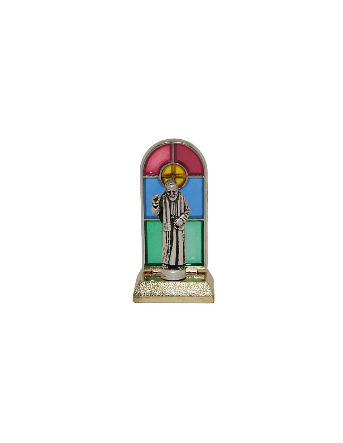 Estatua que representa al Padre Pío en metal plateado, con una bonita vidriera de colores detrás. Disponible en dos variaciones de vitral (rojo-azul-verde o azul-naranja-verde), esta pequeña estatua combina solidez y brillantez espiritual. Perfecto para acompañar la oración o decorar un espacio personal de fe.