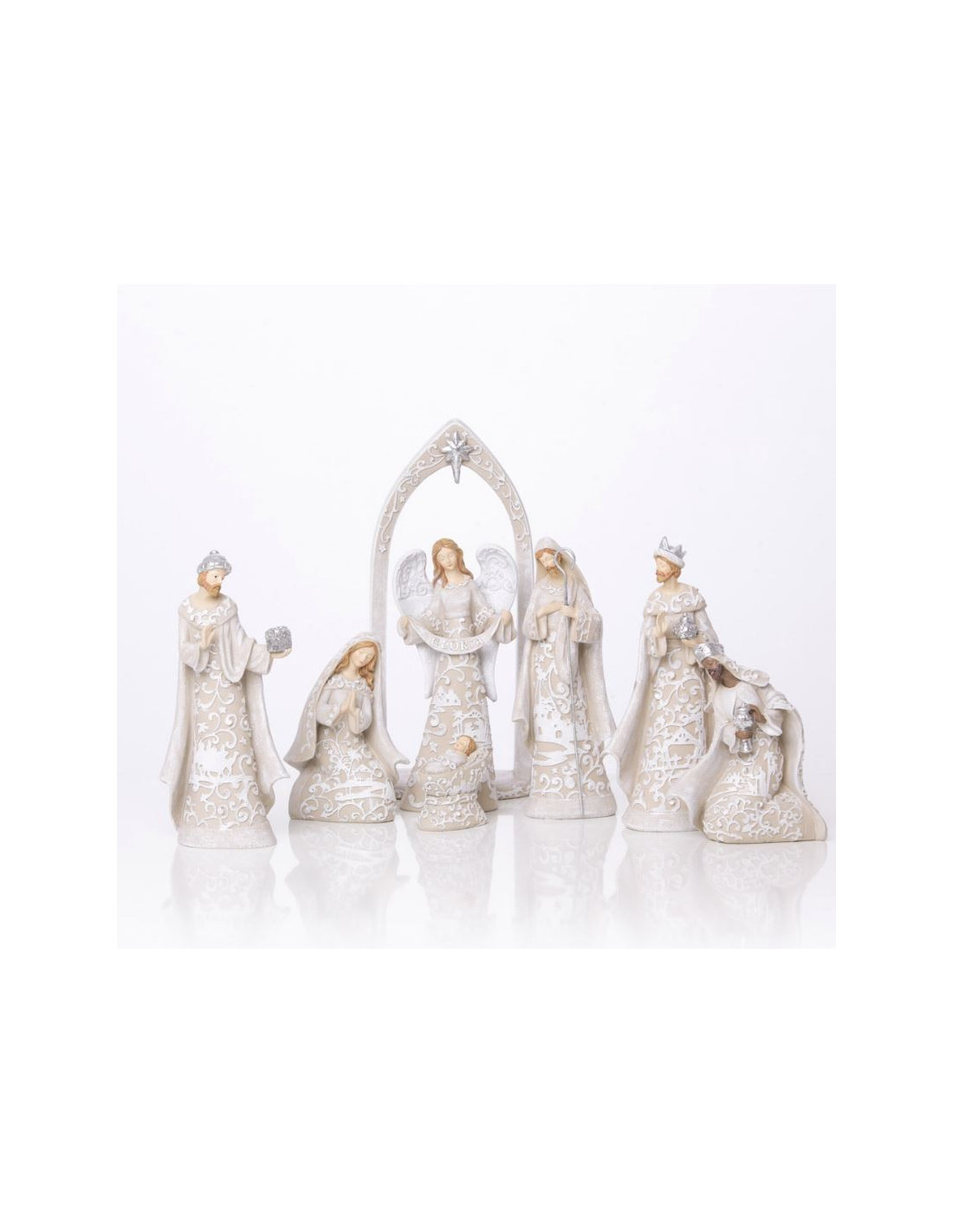 Belén de Navidad en resina – 24,5 cm – Tonos marfil y plata