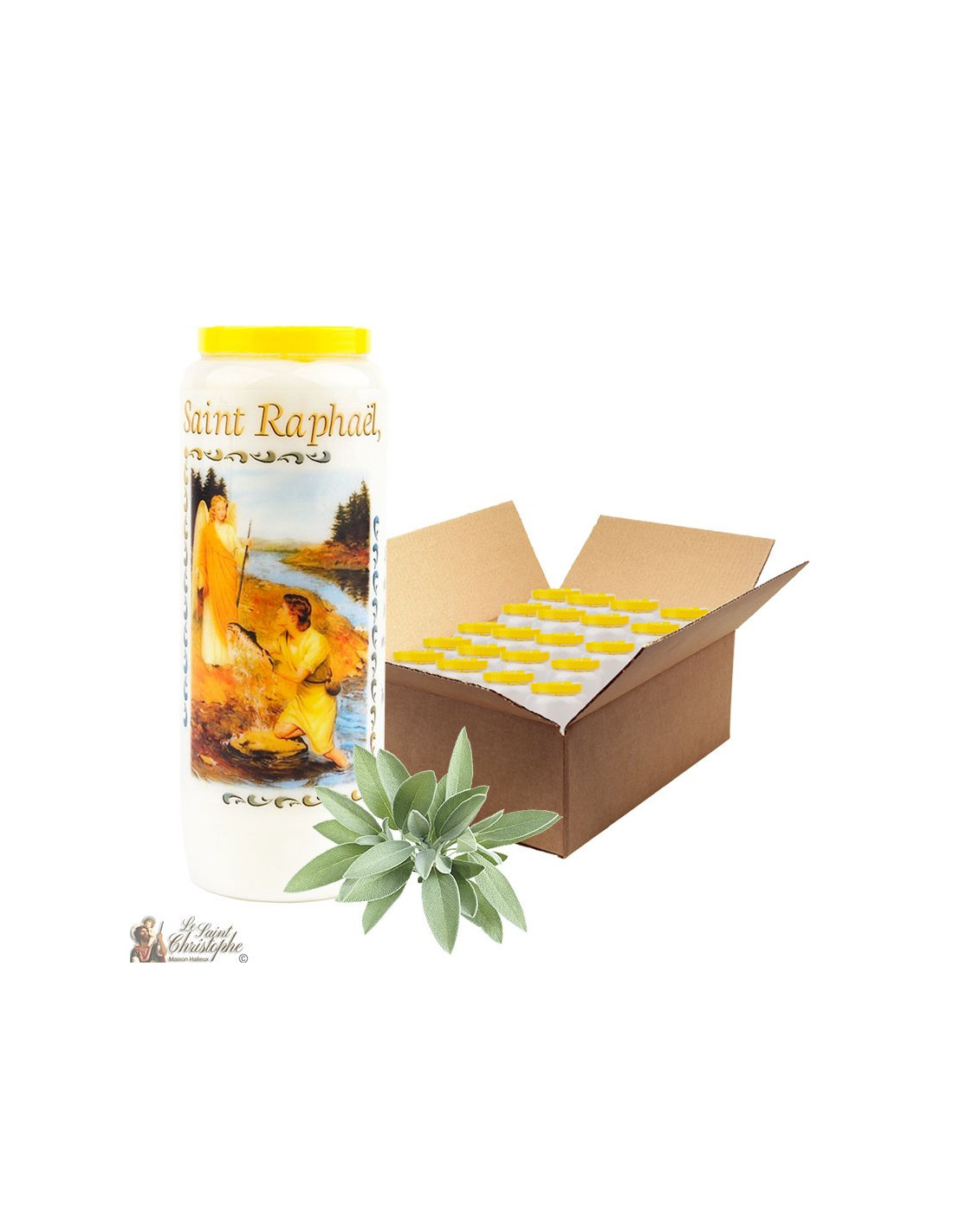 Vela de novena de vegetales con una imagen de oración a San Rafael y salvia perfumada. Una combinación perfecta para la purificación.
