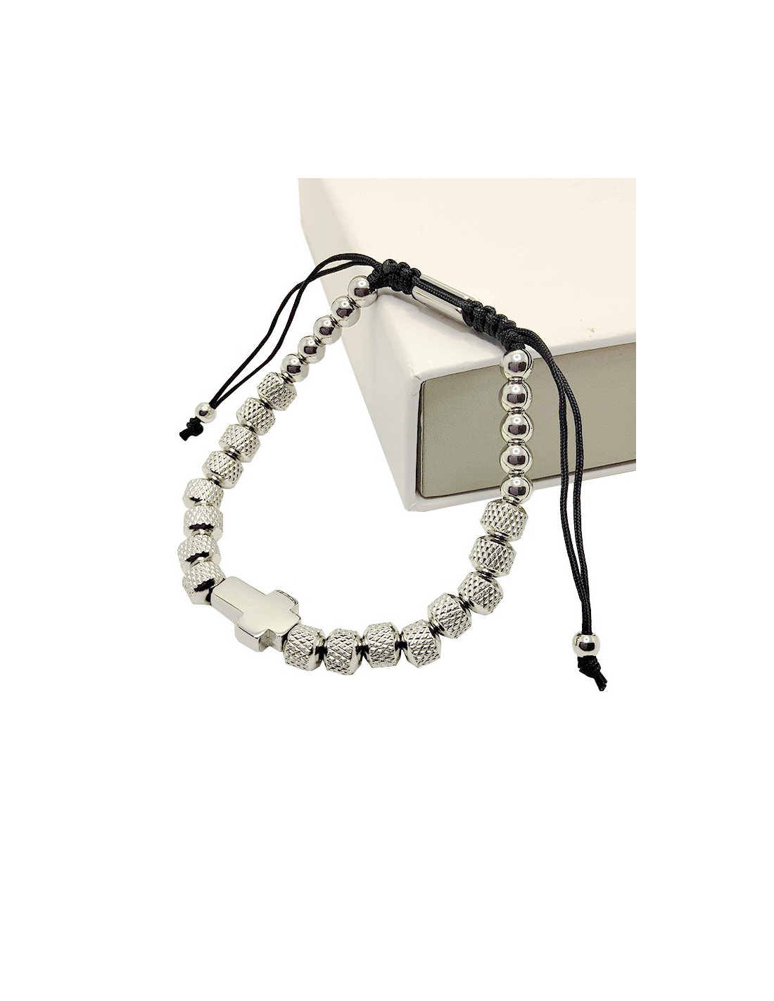 Pulsera con cruz y perlas plateadas de acero inoxidable montadas sobre un cordón negro con cierre ajustable de macramé.