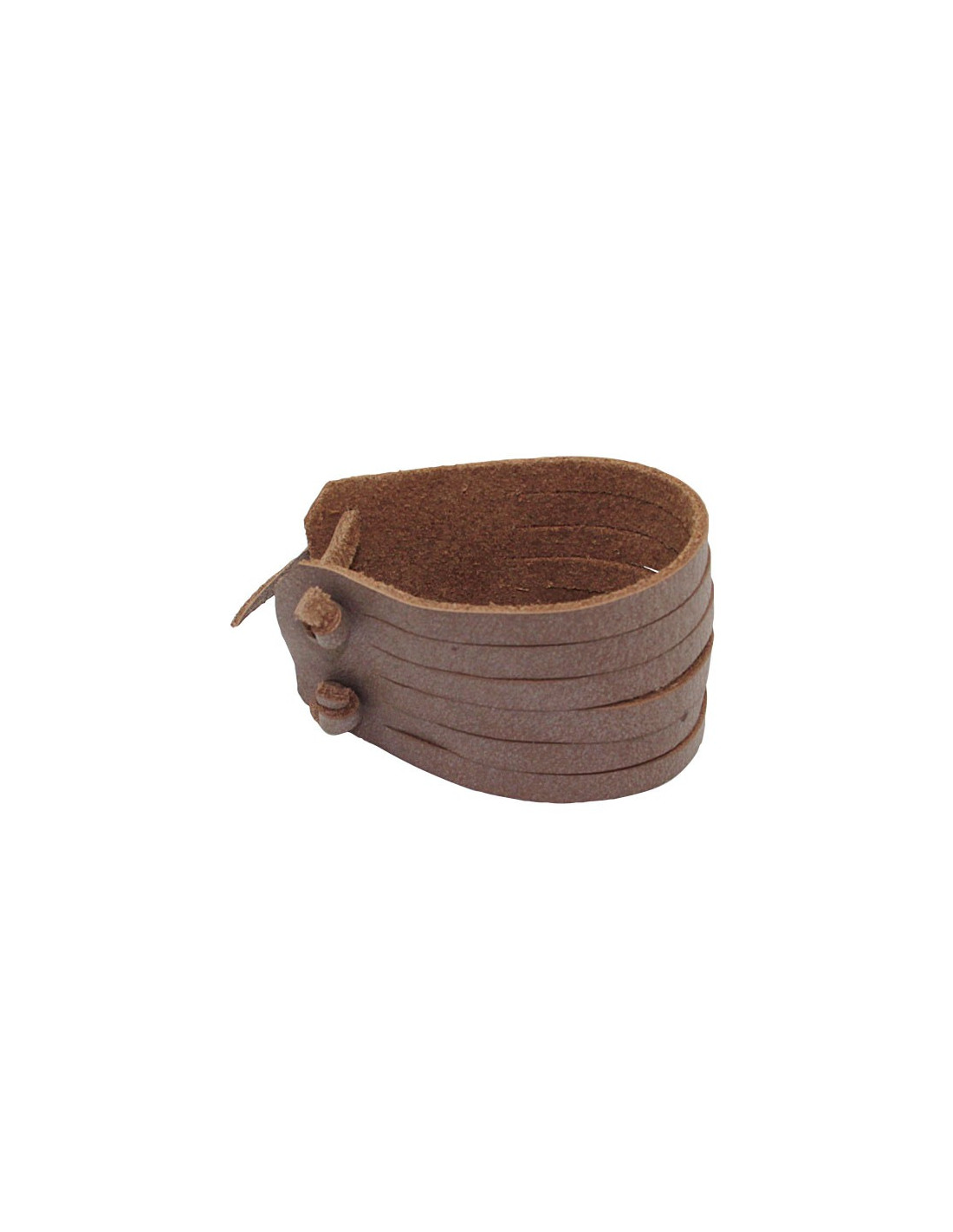 Un gran brazalete de cuero marrón, hecho a mano por nuestros socios artesanos. En una pieza, la parte más ancha ha sido cortada en seis tiras para añadir flexibilidad al cuero, pero también un lado moderno.