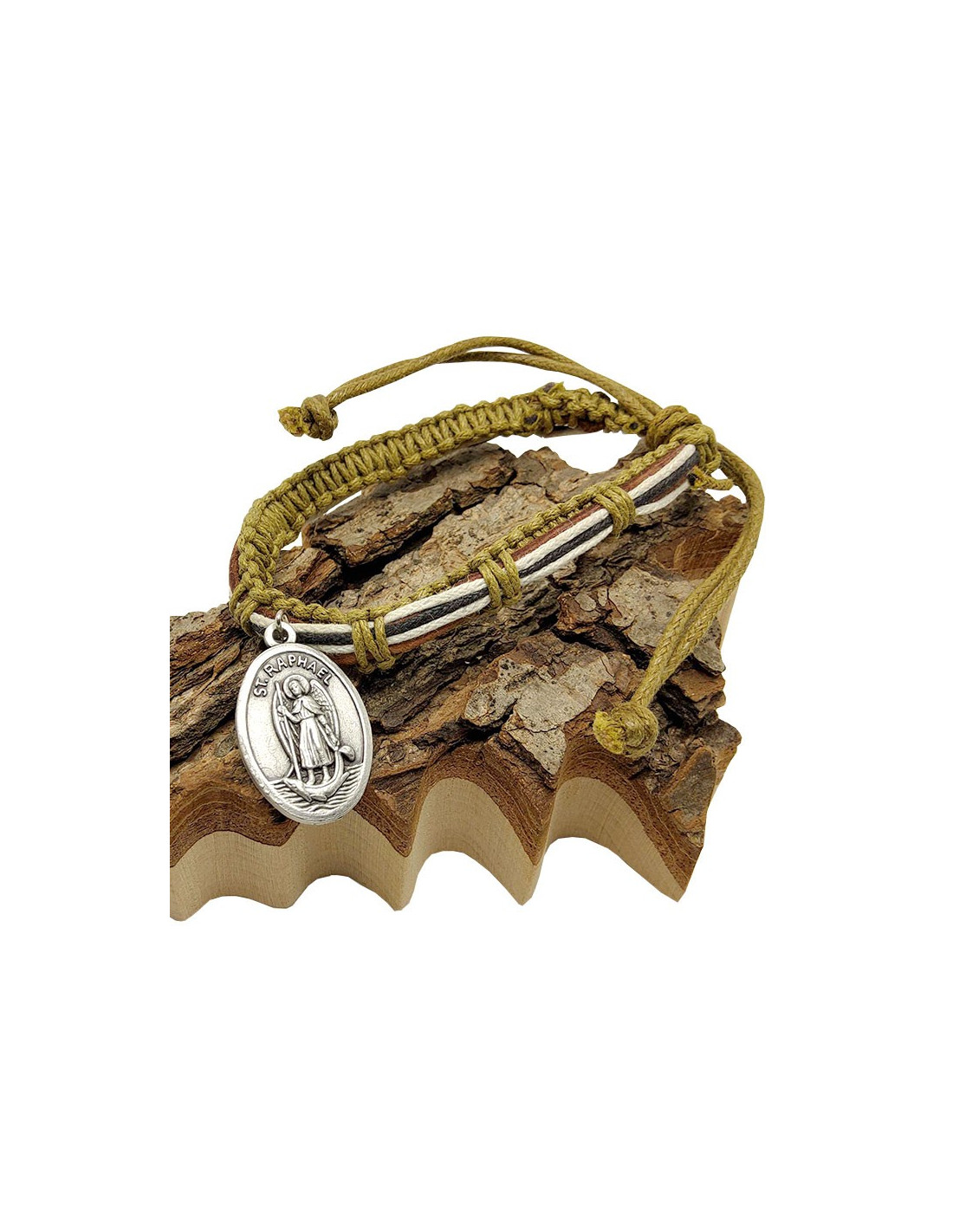 Pulsera de cordones trenzados en colores naturales con medalla de metal fantasía del Arcángel San Miguel y del Arcángel San Rafael. Los cordones son de color caqui, negro y blanco con un cordón de cuero. Es una mezcla natural, casi bohemia, que combina fácilmente con todo.