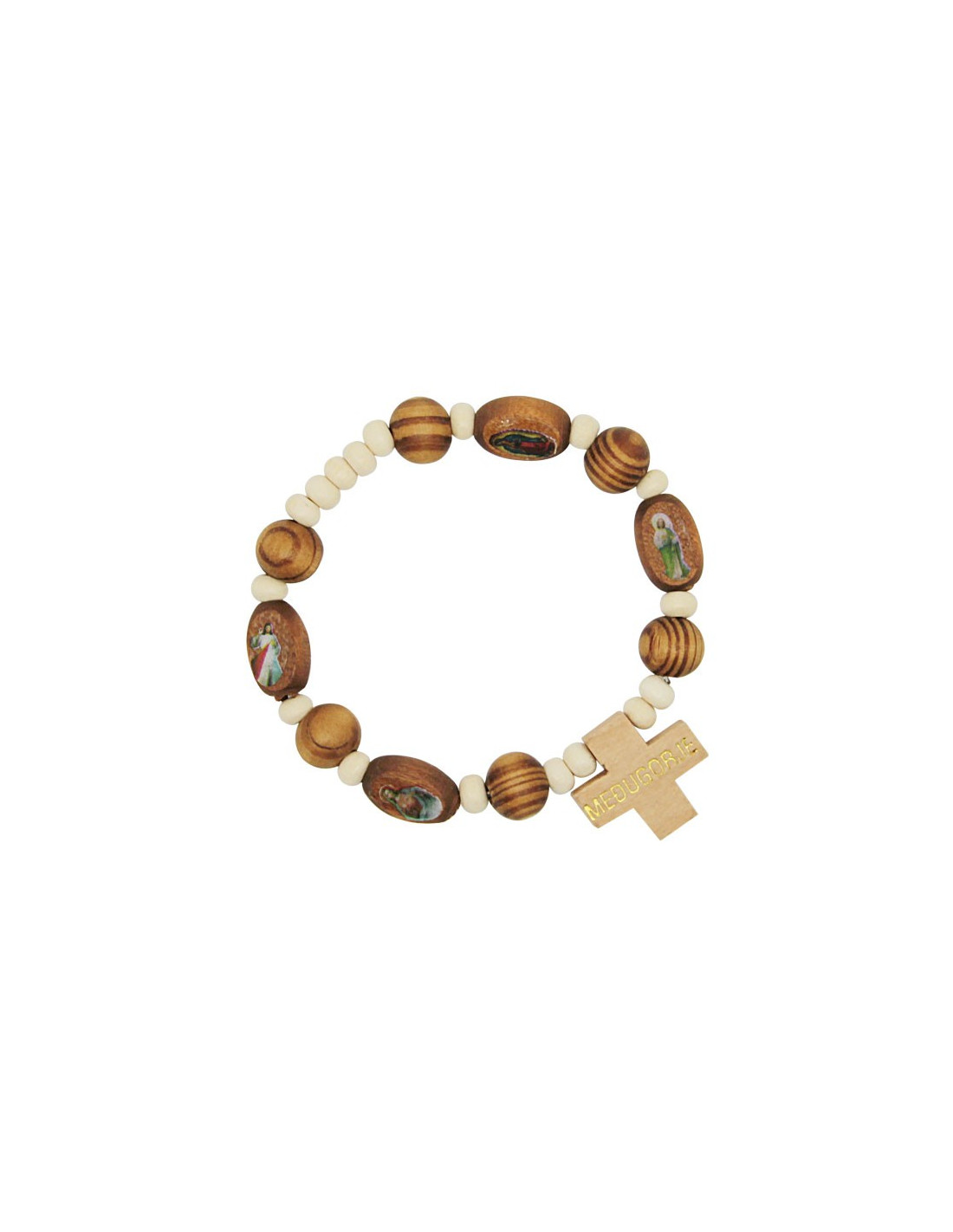 Pulsera con cuentas de madera clara y madera de olivo natural. El colgante en forma de cruz lleva grabado "Medjugorje", en referencia a las apariciones marianas. Las cuentas muestran imágenes de santos, como el Cristo de la Divina Misericordia. Sirve como decenario.