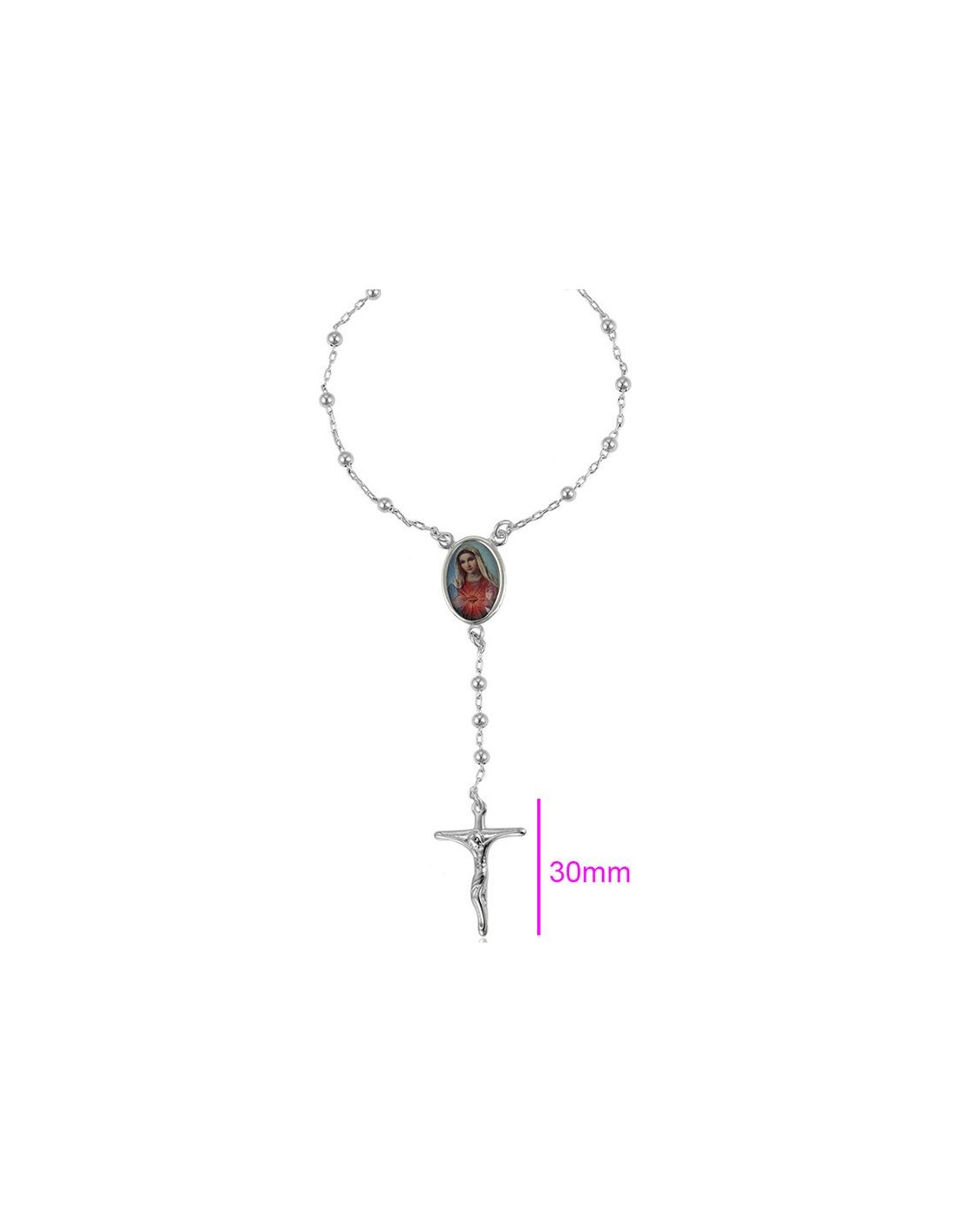 Esta pulsera de metal plateado es fina y delicada. Está decorada con una medalla con la efigie del Sagrado Corazón de María, símbolo del Amor incondicional, y la cruz cristiana con la figura de Jesucristo. Los pequeños puntos dispersos en la pulsera te permiten utilizarla como un diez y acompañar tus oraciones en cualquier momento.