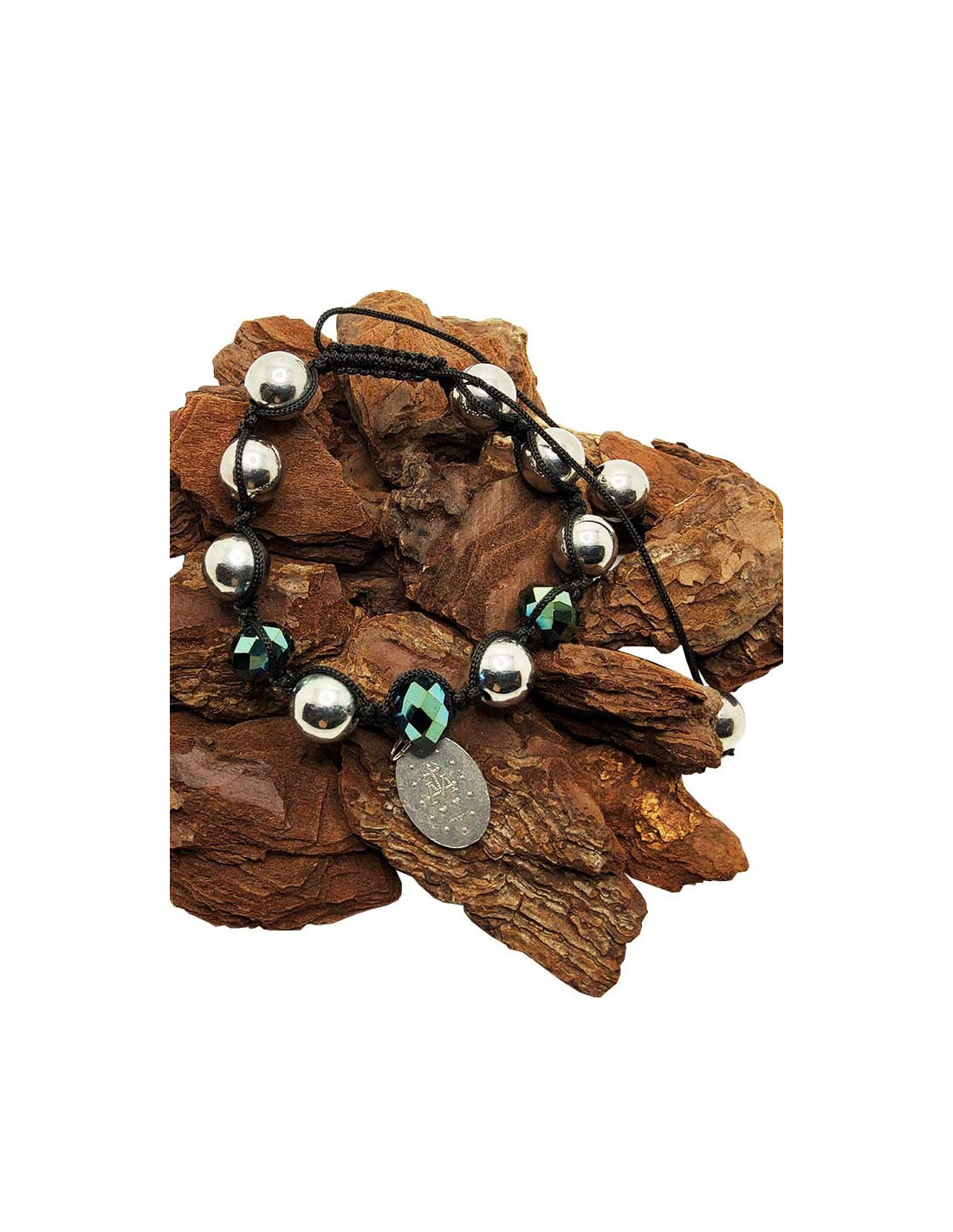 Esta pulsera Shamballa fusiona estética y espiritualidad. Montada sobre un cordón negro ajustable, combina cuentas grises brillantes con efecto metálico y cuentas facetadas en verde iridiscente. Está adornada con una medalla metálica decorativa que representa a la Virgen Milagrosa. Esta medalla es símbolo de protección divina. Se usa para pedir gracias o apoyo en momentos difíciles. Una pulsera inspiradora, moderna y con un toque de significado. Esta pulsera unisex es ajustable gracias a los nudos de macramé, lo que la hace ideal tanto para muñecas grandes como pequeñas. Ancho de la pulsera: 16,5 a 26,5 cm
