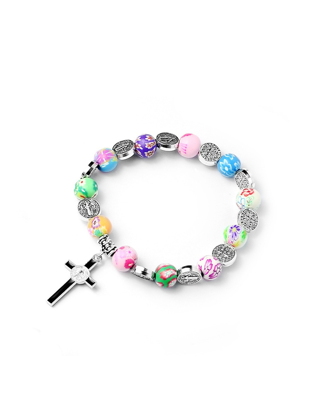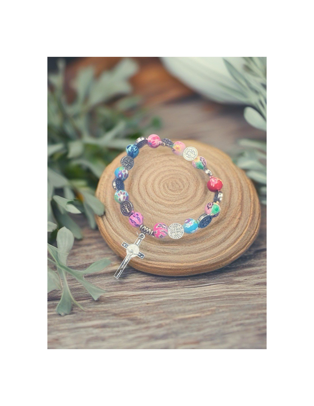 Pulsera San Benito – Medallas y cuentas de arcilla multicolor