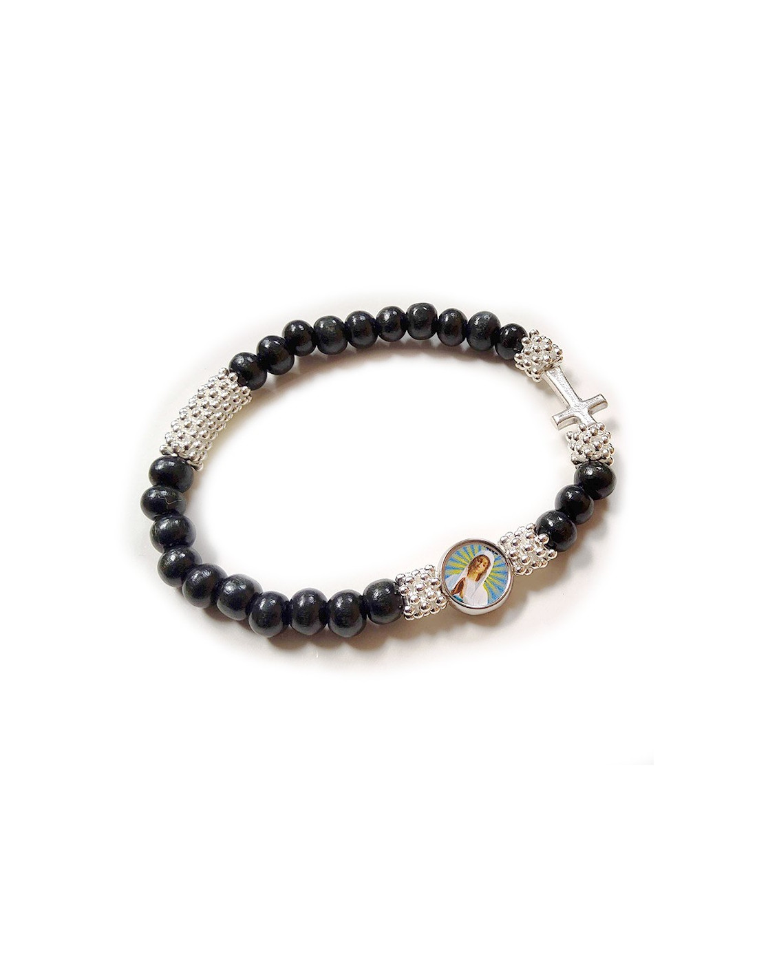 Pulsera elástica de madera y cuentas de plástico plateadas, que incluye una pequeña cruz que puede utilizarse como decena, también llamada "dizainier", con una imagen de la Virgen de Banneux: Nuestra Señora de los Pobres. Las cuentas de madera están teñidas de negro.
