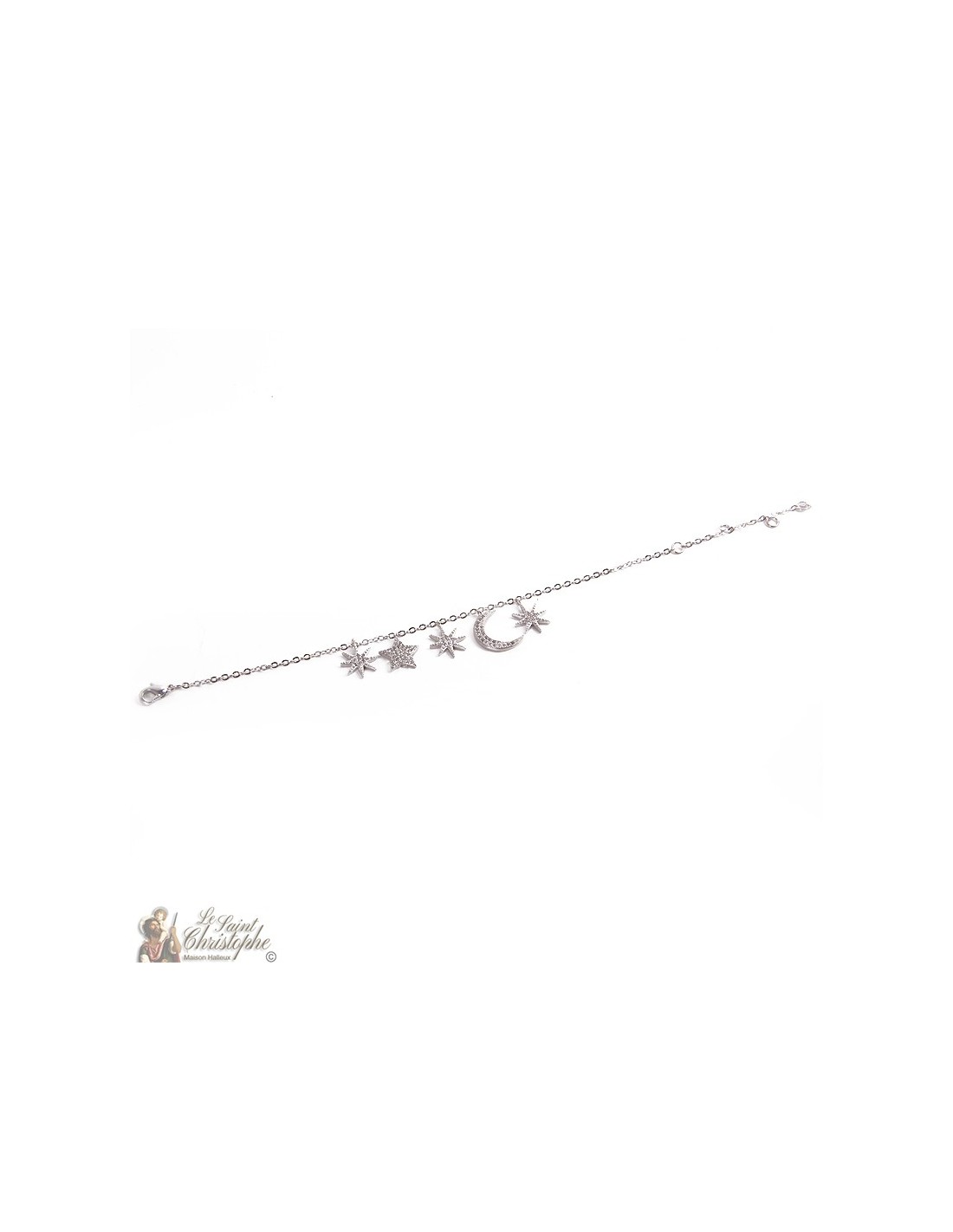 Pulsera fina de acero inoxidable plateado con dijes esparcidos por la cadena. Los colgantes tienen forma de varias estrellas y de luna creciente, y todos llevan incrustaciones de cristales de circón.