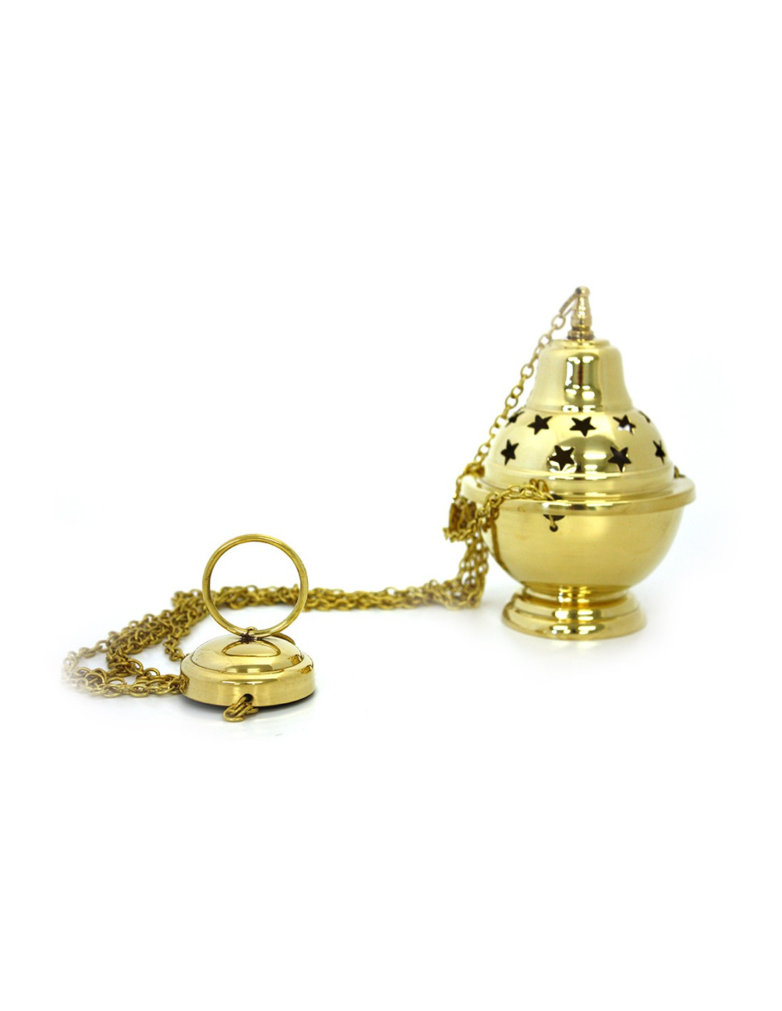 Este incensario tiene un diseño sencillo y se distingue por sus orificios en forma de estrella. Perfecto para el ámbito litúrgico, invita a la interiorización. Totalmente hecho a mano, está fabricado en cobre dorado, un color adecuado para cualquier ocasión. Las cadenas permiten colgar el incensario.