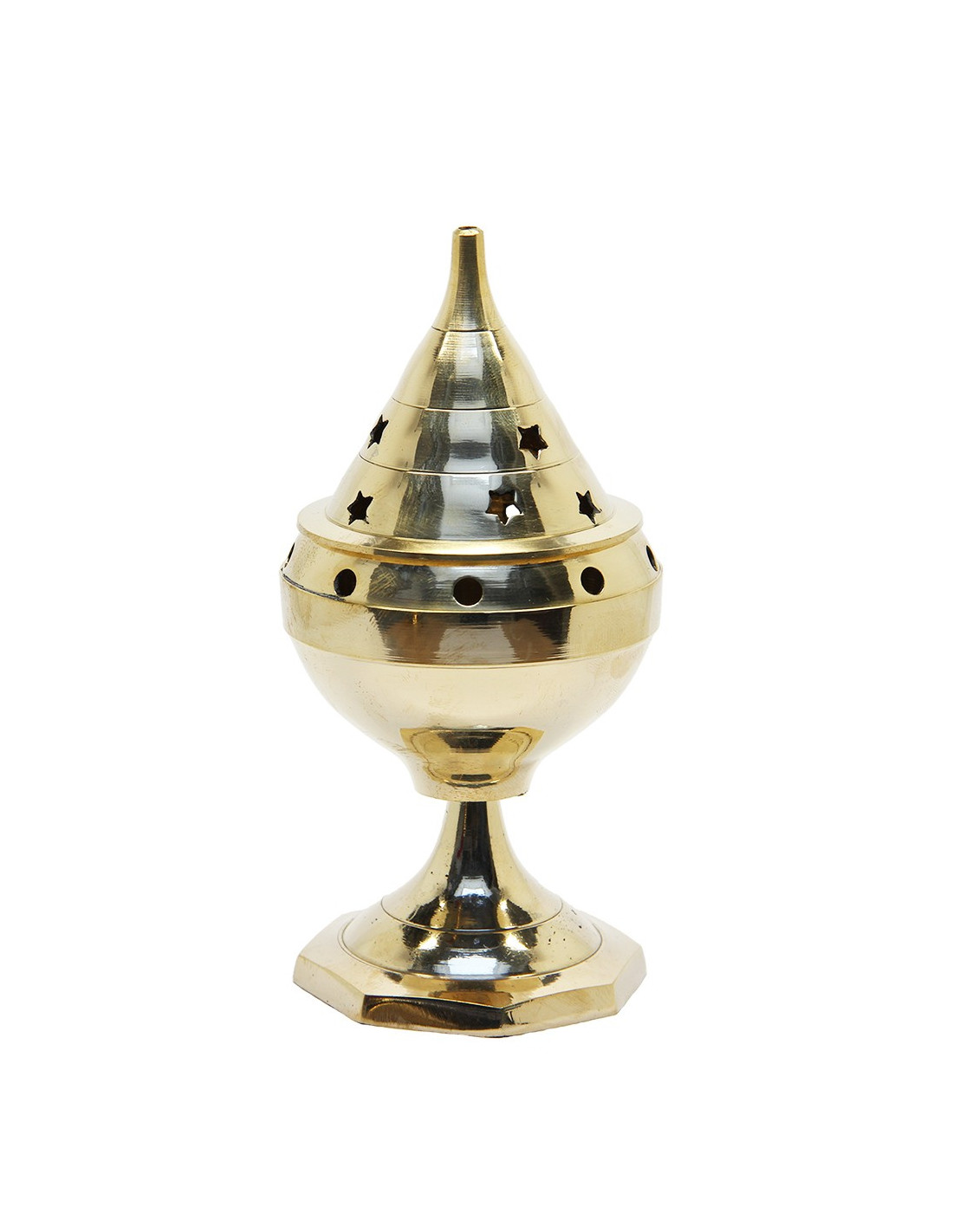 Este quemador de incienso hecho a mano es de cobre dorado. Su tapa está delicadamente trabajada y decorada con estrellas.
