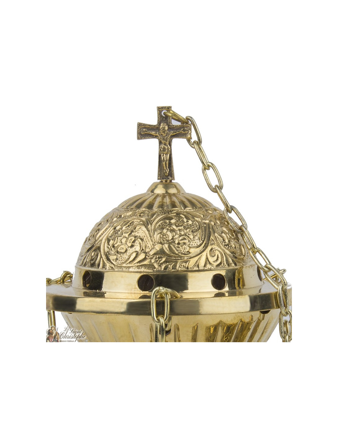 Este incensario de cobre dorado está diseñado para ser colgado o colocado según sus necesidades gracias a las cadenas. Es un accesorio perfecto para ceremonias y celebraciones religiosas como las misas. Su delicado diseño está finamente trabajado con un friso floral en su superficie. Está decorada con una cruz con la figura de Cristo. Este artículo ha sido trabajado a mano.