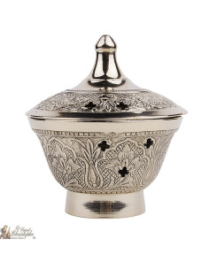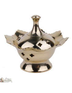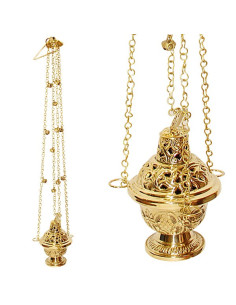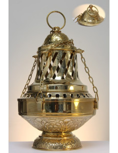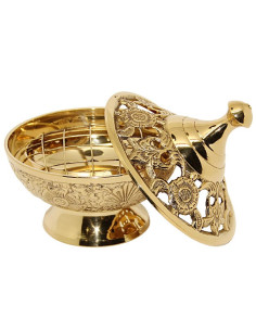 Hermoso incensario de cobre con matices dorados, ha sido hecho completamente a mano. Consta de 3 partes: asa, tapa abatible y parrilla interior para carbón pequeño o grande. El incensario está coronado por una cruz, los agujeros están incluidos en un hermoso fresco grabado y el pie también está tallado.