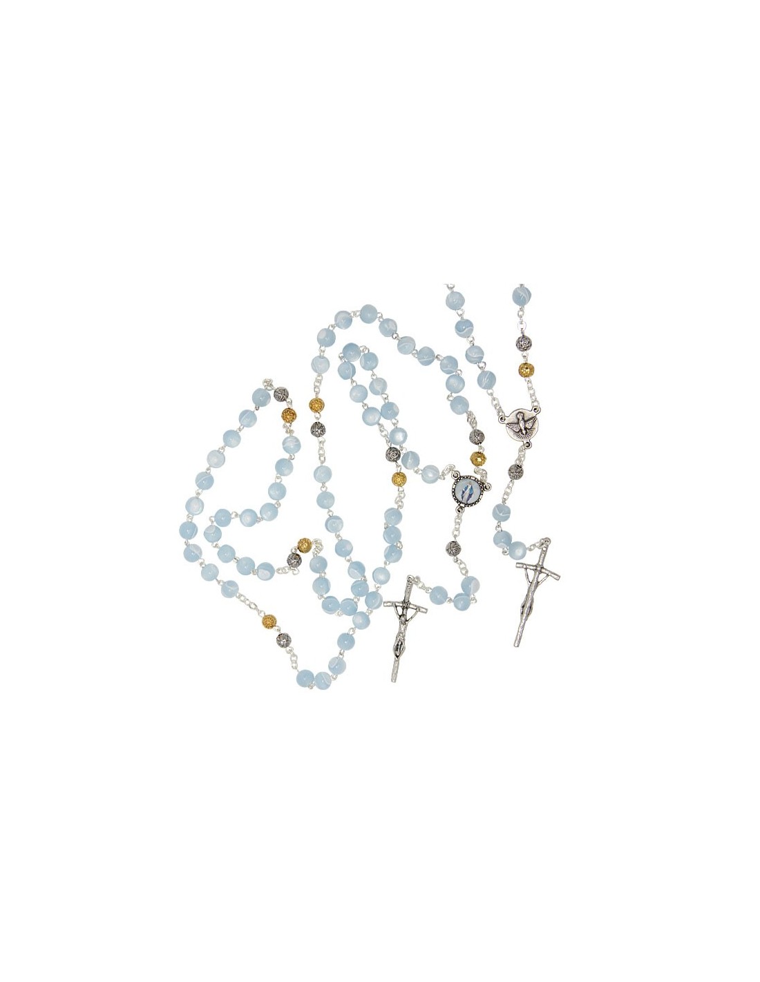 Rosario religioso con cuentas azules y blancas montadas sobre una cadena de plata