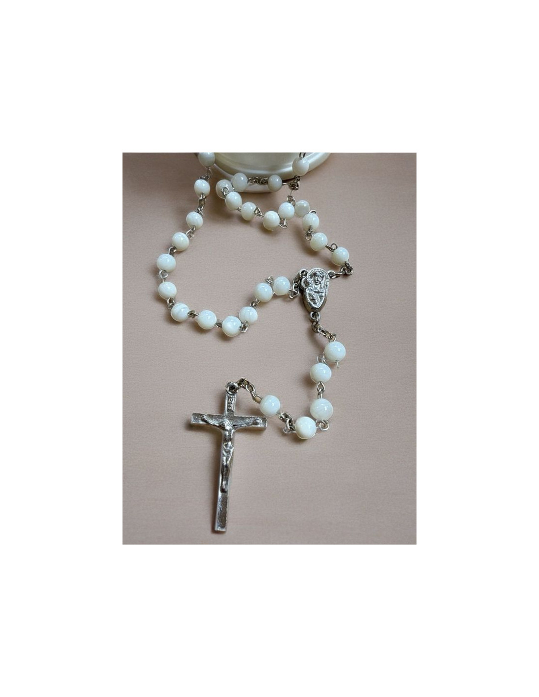 Un rosario sobrio y elegante, cuyas cuentas de nácar aportan un toque luminoso y precioso. Representa perfectamente la pureza, la fe y la protección.