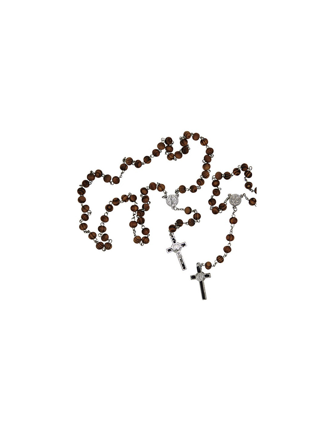 Montado sobre una cadena de color metal plateado, este rosario une tradición y elegancia. Las cuentas de madera de 8 mm ofrecen una sujeción cómoda para el rezo del Rosario.