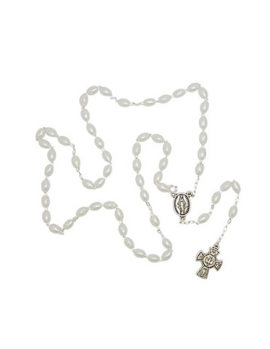 Rosario en cuentas alargadas de color blanco nacarado con el corazón de la Virgen Milagrosa y bonita cruz con diferentes santos... Sagrado Corazón de María, Milagrosa, San Cristóbal, Sagrado Corazón de Jesús, San José, San Antonio, Pequeño Jesús de Praga, Scapulaire, rue du Bac et le St Esprit .