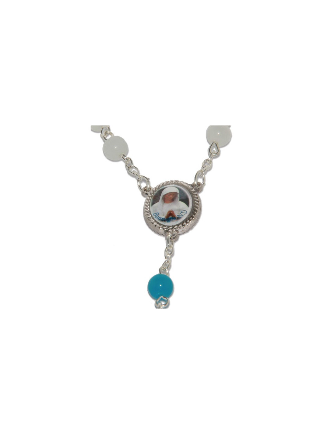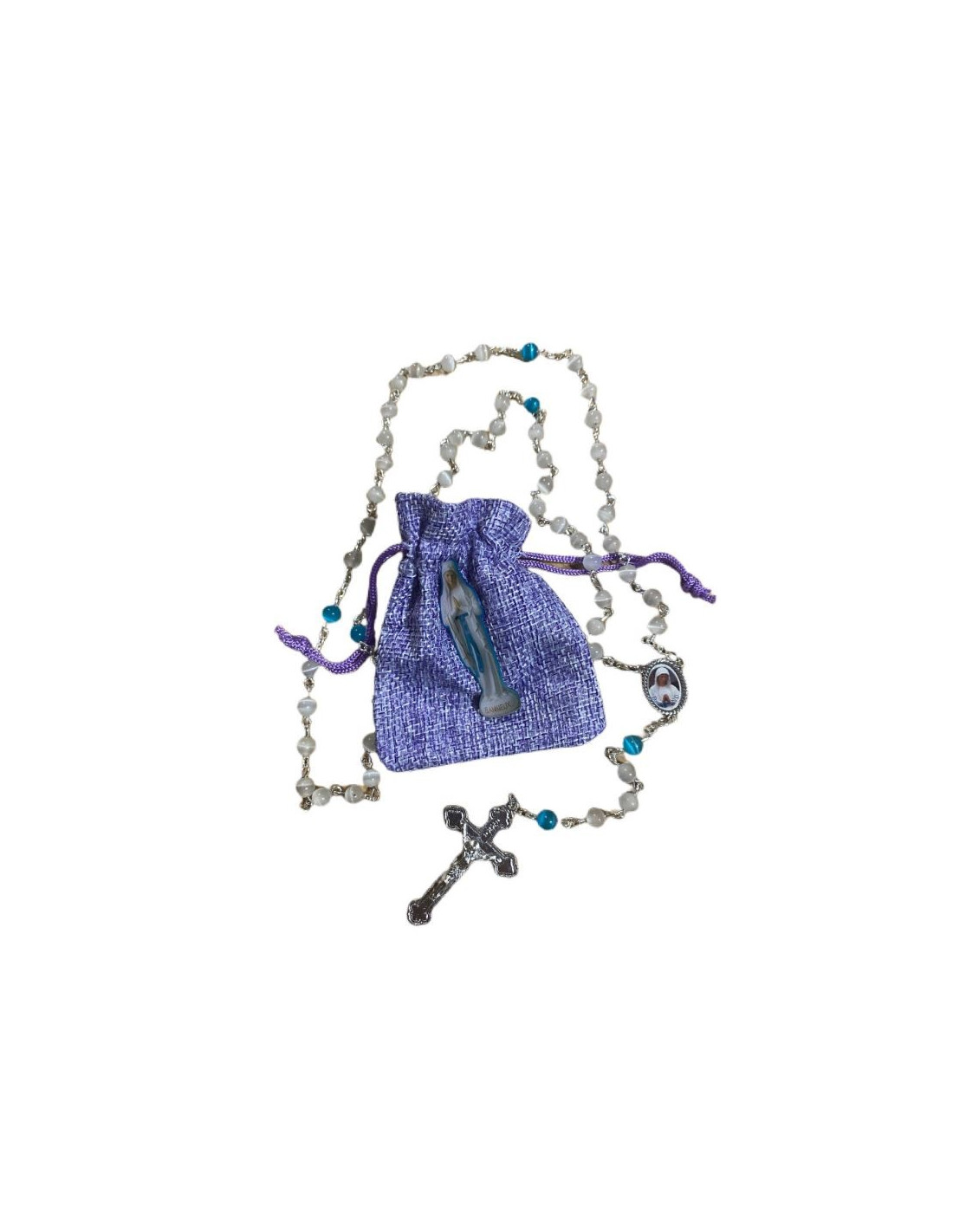 Rosario de Banneux, montado en una cadena de plata. Las cuentas son de piedra lunar blanca y azul ojo de gato. La medalla del rosario tiene la imagen de la Virgen de los Pobres, al igual que el alfiler que lleva la bolsa.